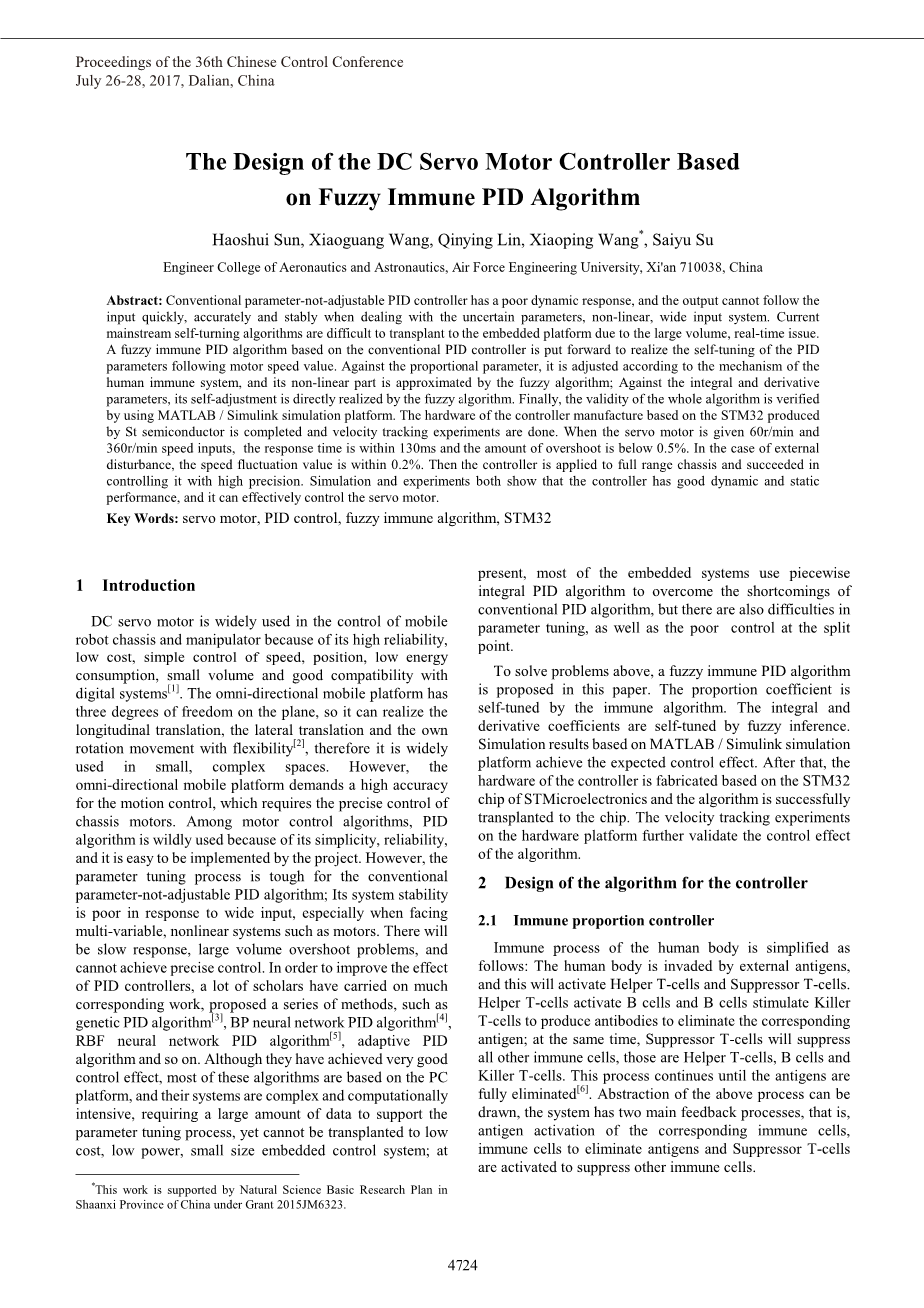 原文标题 The Design of the DC Servo Motor Controller Based on Fuzzy Immune PID Algorithm