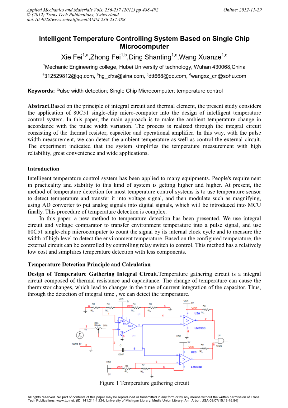 本文提出了一种新的温度检测方法。我们使用积分电路和电压比较器将环境温度转换为脉冲信号,并使用80C51单片机对内部时钟周期的信号进行计数,并测量高电平的宽度以检测环境温度。根据配置的温度,可以通过控制继电器开关来控制外部电路。这种方法成本相对较低,并且可以用较少的元件简化温度检测。
