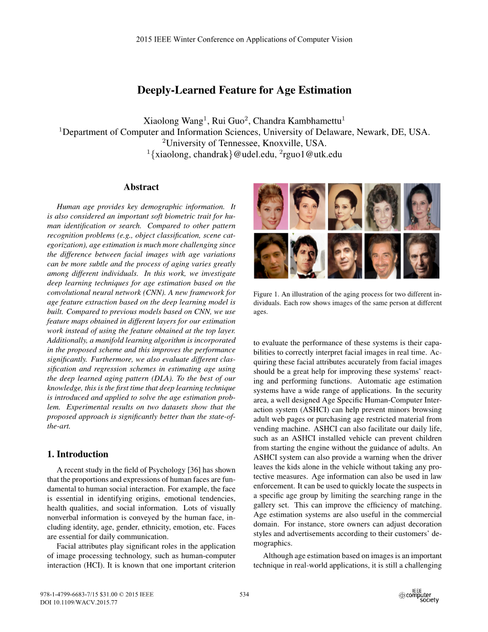 Abstract: Human age provides key demographic information. It is also considered an important soft biometric trait for human identification or search. Compared to other pattern recognition problems (e.g., object classification, scene categorization), age estimation is much more challenging since the difference between facial images with age variations can be more subtle and the process of aging varies greatly among different individuals. In this work, we investigate deep learning techniques for age estimation based on the convolutional neural network (CNN). A new framework for age feature extraction based on the deep learning model is built. Compared to previous models based on CNN, we use feature maps obtained in different layers for our estimation work instead of using the feature obtained at the top layer. Additionally, a manifold learning algorithm is incorporated in the proposed scheme and this improves the performance significantly. Furthermore, we also evaluate different classification and regression schemes in estimating age using the deep learned aging pattern (DLA). To the best of our knowledge, this is the first time that deep learning technique is introduced and applied to solve the age estimation problem. Experimental results on two datasets show that the proposed approach is significantly better than the state-of-the-art.
