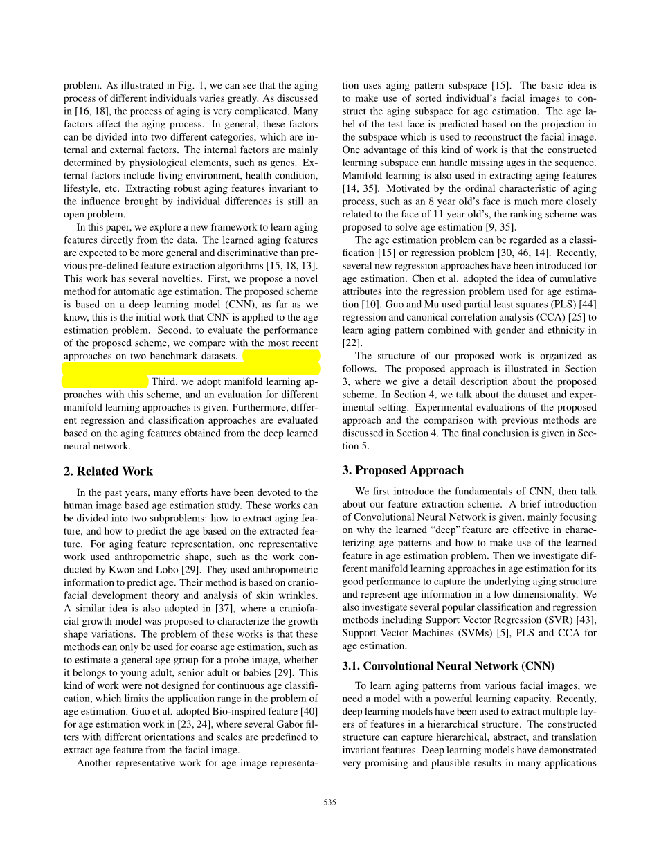 年龄问题可以被看做是一个分类[7]或者回归问题[9]。最近,一些新的回归方法被引入年龄估计。在2013年,Chen等人将累计属性的想法用于年龄估计[10]。在2014年,郭和幕采用将偏最小二乘(partial least squares ,PLS)回归[11]和典型相关分析(canonical correlation analysis,CCA)[12]结合的性别和种族的老化模式[13]。