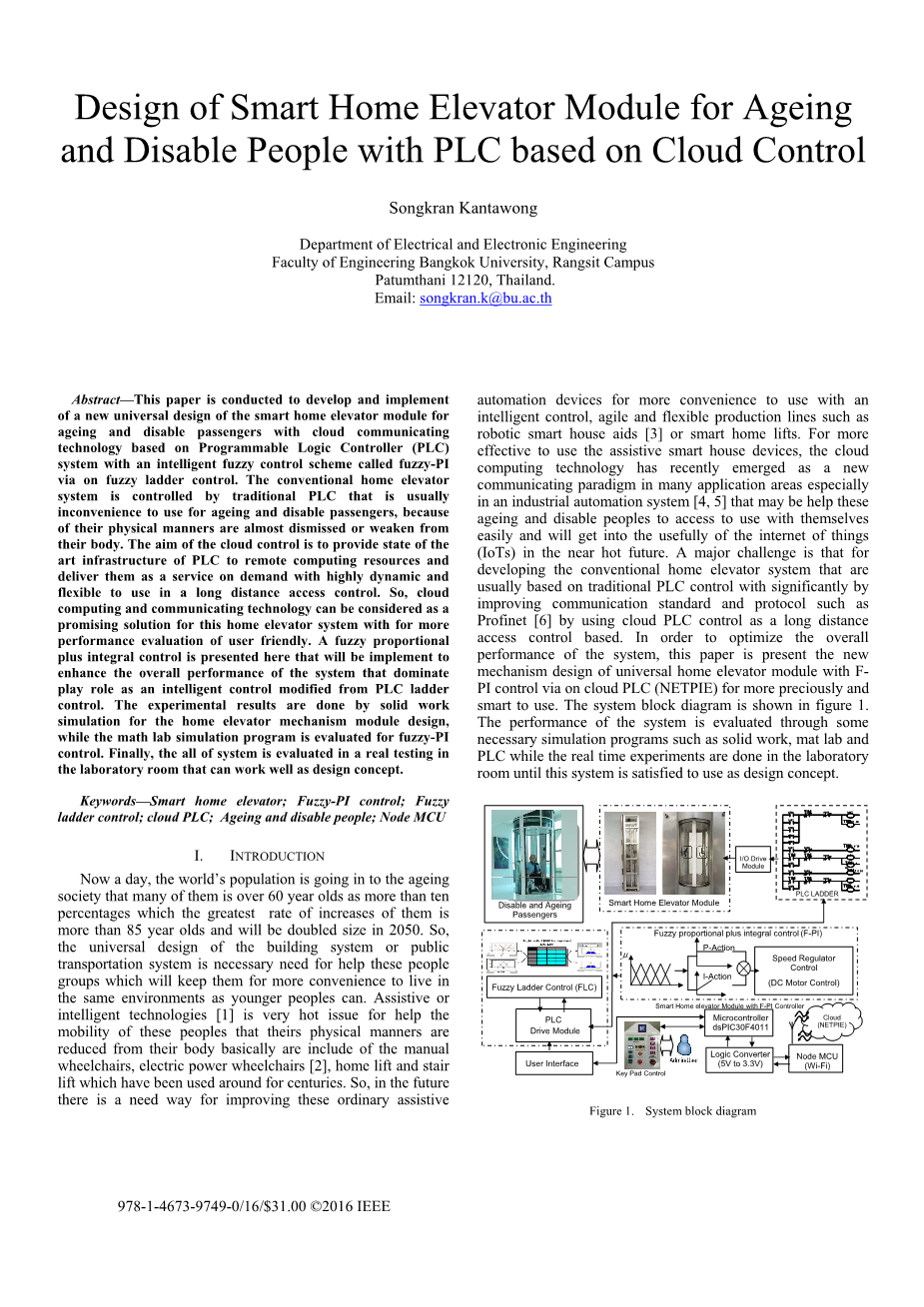 摘要:本文旨在开发和实现基于可编程逻辑控制器(PLC)的云通信技术老龄和轮椅使用者智能家居电梯模块的新通用设计,系统具有通过模糊梯形图控制称为模糊PI的智能模糊控制方案。传统的家用电梯系统由传统的PLC控制,通常不方便老化和禁用乘客,因为他们的身体方式几乎被关闭或者被削弱。云控制的目的是为PLC提供远程计算资源的最新基础设施,并将其作为服务按需提供高度动态和灵活的长途访问控制。因此,云计算和通信技术可以被认为是这个家用电梯系统的有前途的解决方案用户友好的性能评估。本文提出了一种模糊比例加积分控制,旨在提高系统的总体性能,该系统主导作为从PLC梯形图控制修改的智能控制的作用。实验结果由家用电梯机构模块设计的实体模拟完成,数学实验室模拟程序对模糊PI控制进行评估。最后,所有的系统都在实验室进行真正的测试,可以很好地作为设计理念进行评估。