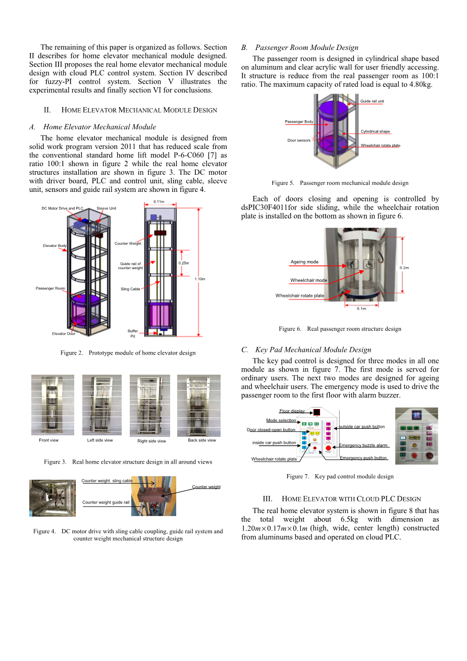 本文的其余部分组织如下。 第二节介绍了家用电梯机械模块的设计。 第三节提出了采用云PLC控制系统的真正的家用电梯机械模块设计。 第四节描述用于模糊PI控制系统。 第五节说明了实验结果,最后说明了第六节的结论。