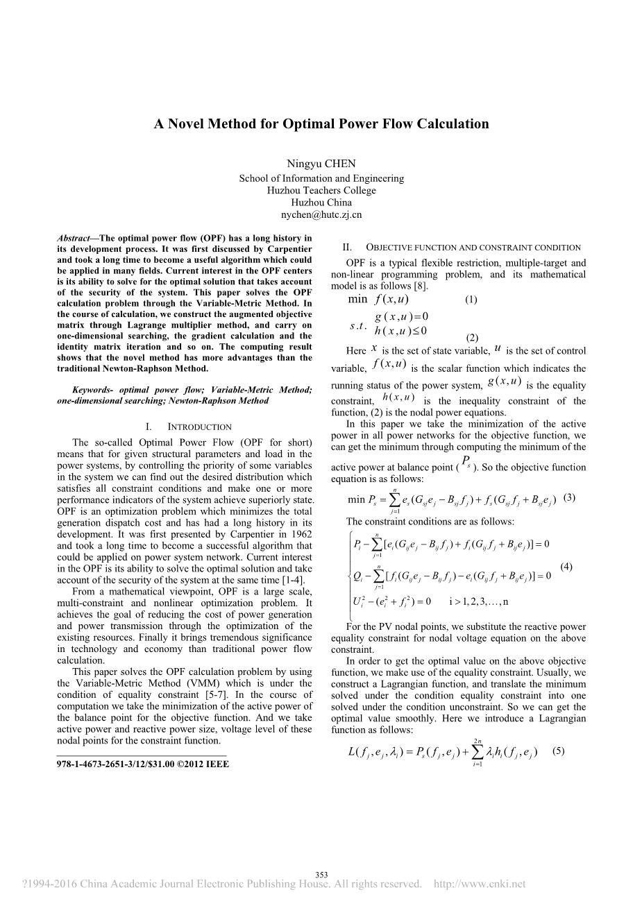 系统的性能指标达到最优状态。OPF是一个优化问题,最大限度地减少总发电调度成本在我国已有很长的历史发展。这是第一次由Carpentier 1962了花了很长时间才成为一个成功的算法可应用于电力系统网络。目前的兴趣在OPF是它的能力,以解决最佳的解决方案,并采取同时系统的安全性帐户[ 1-4 ]。从数学的角度来看,OPF是一个大型,多约束非线性优化问题。它达到降低发电成本的目的和电力传输通过优化现有的资源。最后带来了巨大的意义在技术和经济上比传统的潮流计算。本文利用OPF求解OPF计算问题变尺度法(VMM)下的等式约束条件[ 5-7 ]。在过程中计算我们采取的有功功率最小化目标函数的平衡点。我们把有功功率和无功功率大小,电压等级约束函数的结点。