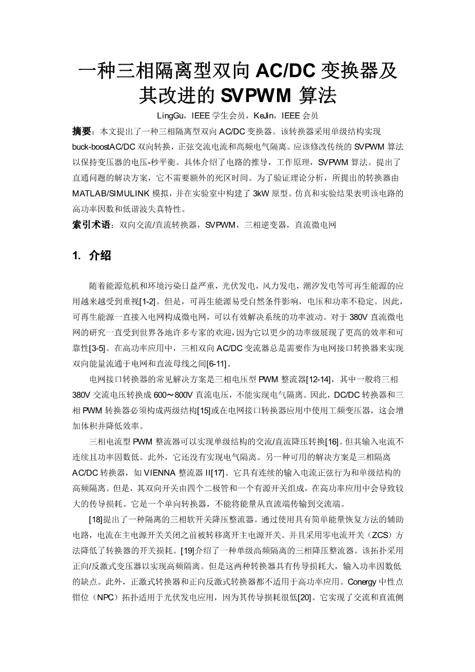 一种三相隔离型双向AC/DC变换器及其改进的SVPWM算法外文翻译资料