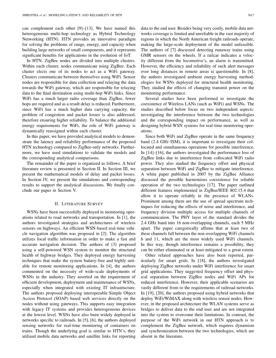 还报告了其他相关方法,尤其是智能电网。在[18]中,作者研究了在WiFi干扰下为智能电网应用部署ZigBee网络。他们建议在ZigBee节点和无线接入点之间进行频率偏移和物理隔离,以减少干扰。然而,它们的适用场景与铁路网的要求大不相同。在[19],[20]中,作者建议使用混合网络,将WiFi/802.16与无线传感器节点一起部署。然而,在提议的架构中,无线局域网系统充当向最终用户传送数据的桥梁,并且没有集成到系统中以克服其局限性。相比之下,在我们的HTN方法中,WiFi网络的目的是补充ZigBee网络,这需要两种技术之间的动态性和同步性,这在文献中是不存在的。