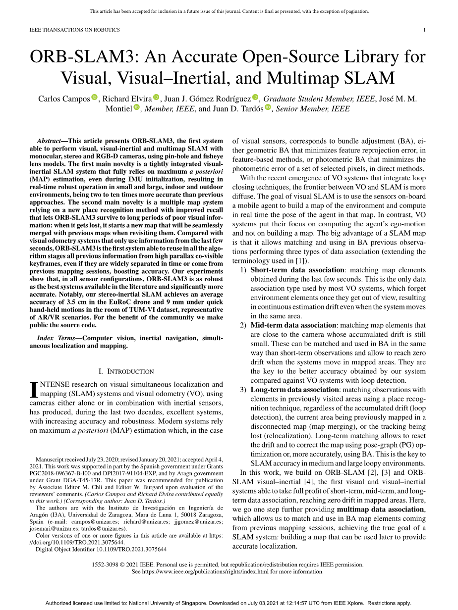 ORB-SLAM3:一个精确的视觉、视觉惯性和多地图SLAM开源库外文翻译资料