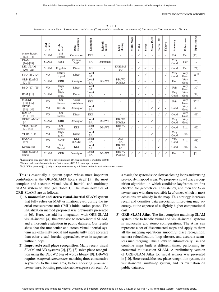 - 表I列出了最具代表性的视觉和视觉惯性系统的概要,展现了用于估计和数据关联的主要技术。表中定性的准确度和鲁棒性评估是基于第七部分的结果以及[2]中报告的PTAM、LSD-SLAM和ORB-SLAM之间的对比。