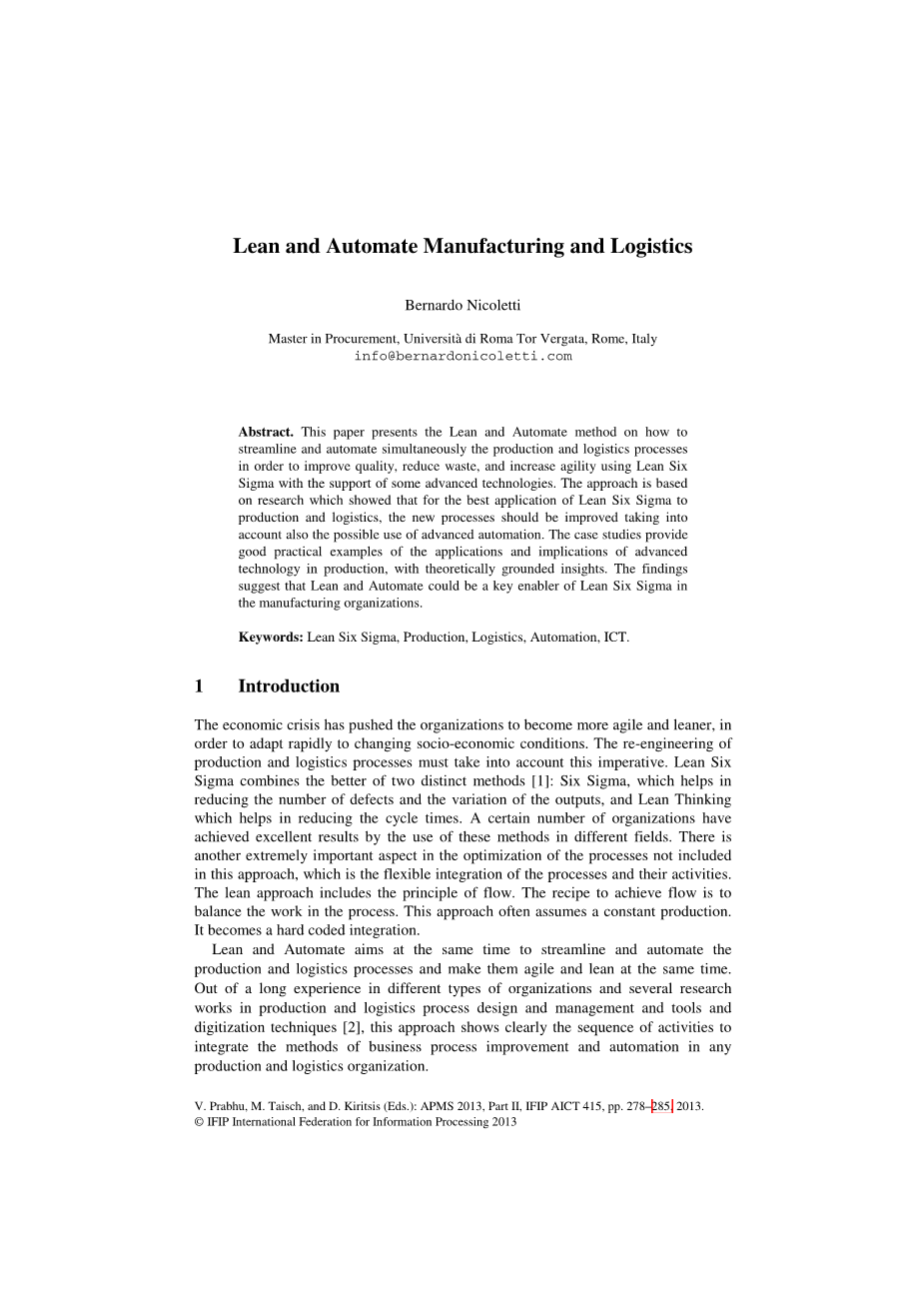 关键词: 精益六西格玛,生产,物流,自动化,信息通信技术。