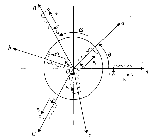 双馈风机的模型可等效为如图1-1所示的模型。其中A、B、C分别为三相定子绕组轴线,且在空间上静止不动;a、b、c为转子绕组轴线,在空间上以转子转速