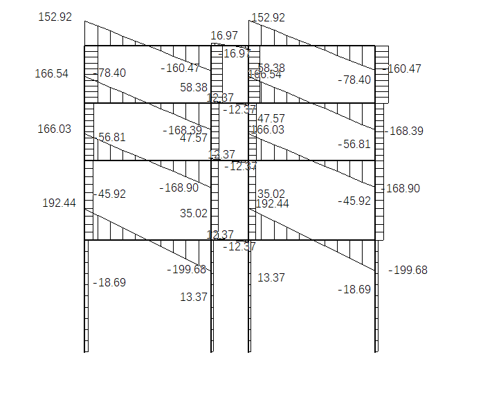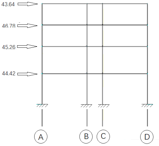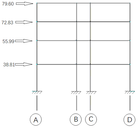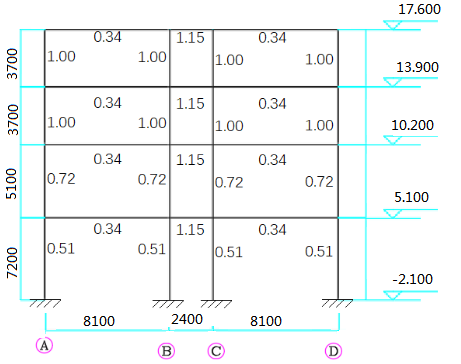 取(15)轴上的一榀框架进行设计和计算,按照上述简化方法,则底层柱长为7.2m,2层柱长为5.1m,3、4层的柱长为3.7m,具体计算简图如下所示。