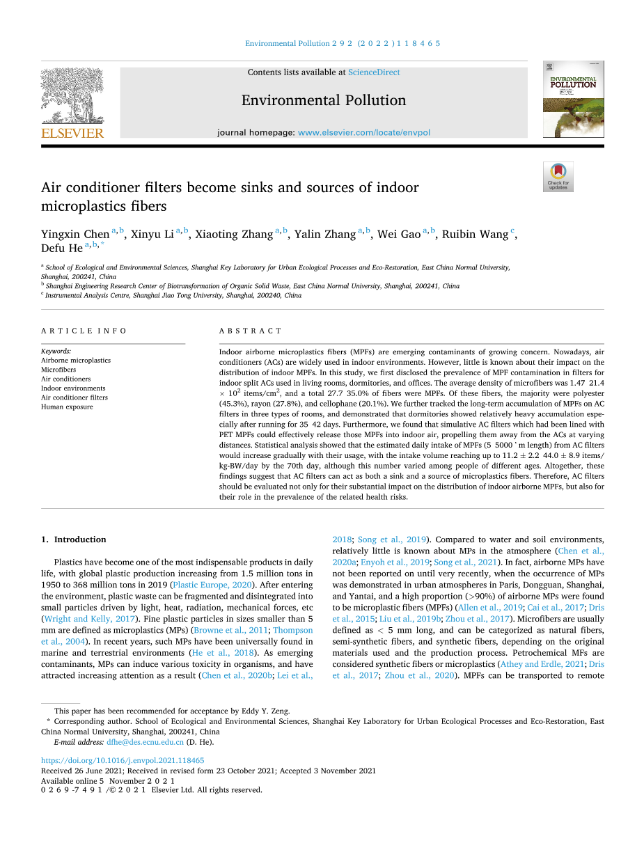 关键词:气载微塑料;超细纤维;空调;室内环境;空调过滤器;人体暴露