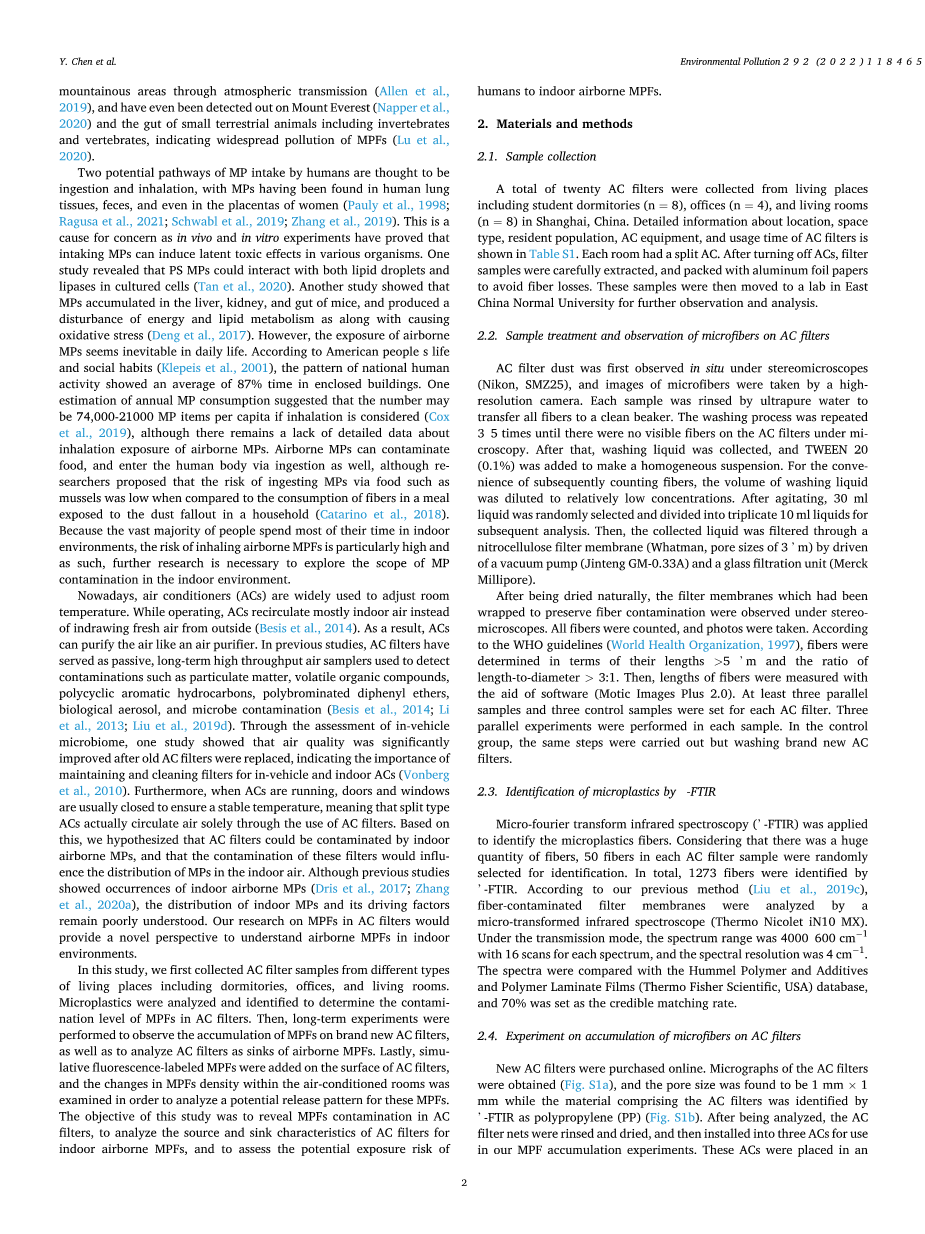 如今,空调设备被广泛用于调节房间的温度,空调设备在运行时,它主要循环室内空气从外部吸入新鲜空气(Besis等人,2014年)。因此,ACs可以像空气净化器一样净化空气。在以前的研究中,空调滤波器用作被动、长期高通量空气采样器,用于检测颗粒物、挥发性有机化合物等污染物,多环芳烃、多溴二苯醚、,生物气溶胶和微生物污染(Besi等人,2014;Li等人,2013年;刘等人,2019d)。通过对车内环境的评估研究表明,更换旧空调滤波器后,空气质量显著下降的现象会有所改善,表明维护和清洁车内和室内空调设备系统的过滤器的重要性(Vonberg等人,2010年)。此外,当ACs运行时,门和窗通常是封闭的,以确保温度稳定,这意味着实际上分体式的空调系统仅通过使用空调过滤器来循环空气。基于此,我们假设空调滤波器可能被室内的微塑料纤维污染,并且这些过滤器的污染会影响室内微塑料纤维的分布。尽管之前的研究显示了室内MPs的存在(Dris等人,2017;Zhang)但是,室内MPs的分布及其驱动因素人们仍然知之甚少。我们对空调滤波器中MPFs的研究将提供一个全新的视角来理解室内空气中的MPF环境。