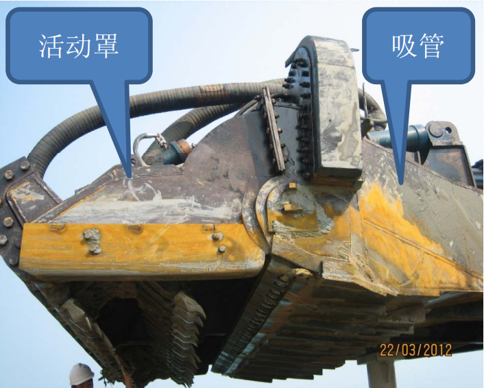 (1)活动罩:它的本体为钢制焊接结构,并装有很多与挖掘相关的部件在它里面,,如耙齿、补水窗、高压冲水喷嘴、格栅等,它是耙头用来进行泥土的挖掘、泥土的切割与冲散、泥浆混合输送的结构,并能由它实现挖掘深度的变化。