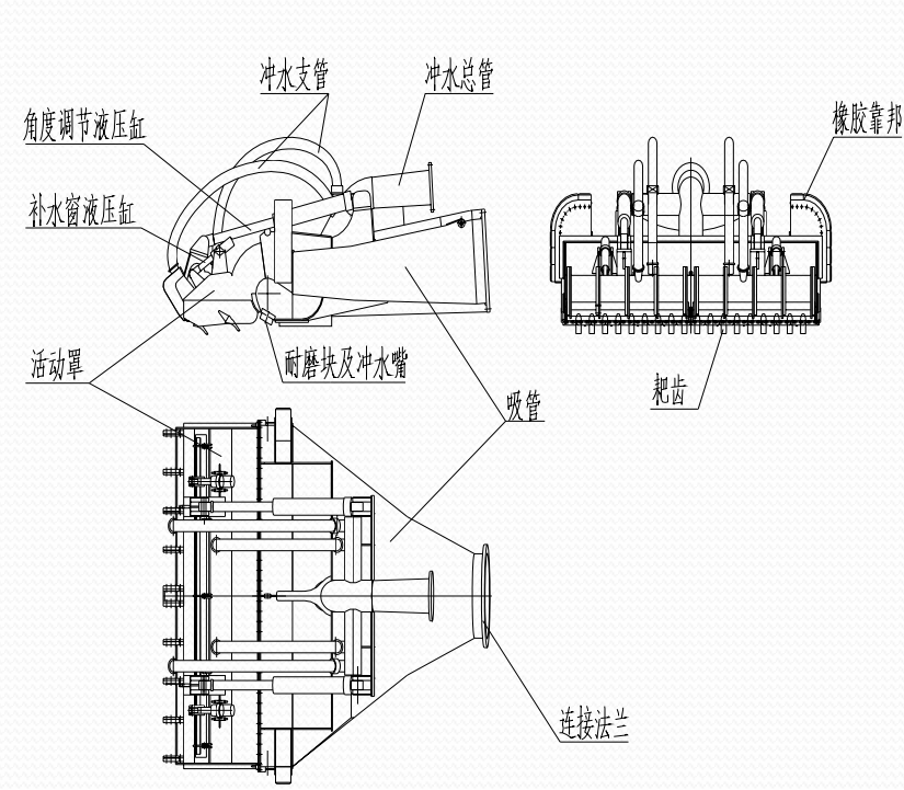 耙头的结构有活动罩、吸管、耙齿、耙头引窗等。其结构三视图如图1.2所示,各部分作用如下: