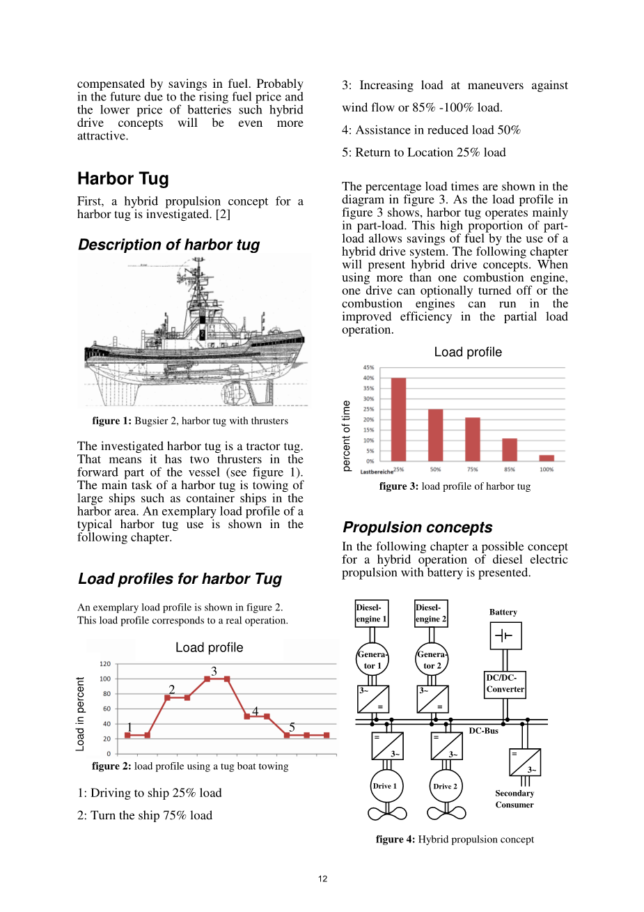 百分比装载时间如图3中的图表所示。如图3中的负荷剖面所示,港口拖船主要在部分装载状态下工作。这种高比例的部分负荷可以通过使用混合动力驱动系统来节省燃料。下一章将介绍混合驱动的概念。当使用一个以上的内燃机时,可以选择关闭一个驱动器,或者内燃机可以在部分负荷操作中以提高的效率运行。