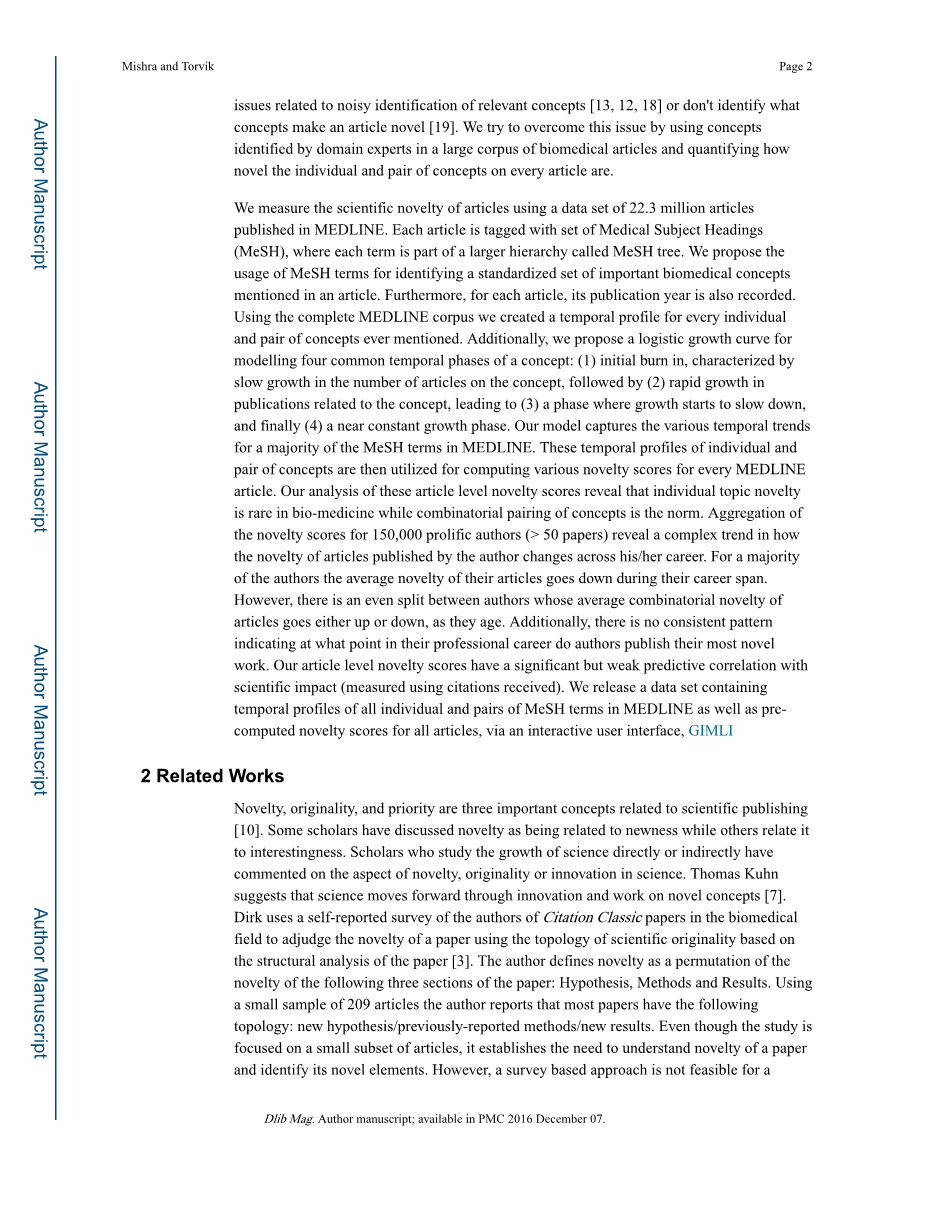 我们认为,在发布之时,它应该是可衡量的,而任何想法的价值和影响都反映了发布后(长时间)发生的事情。文章新颖性的量化度量可以帮助学者追踪科学中概念的起源。先前,学者们使用了各种方法,用于测量物品的新颖性和研究了其影响,以及与协作模式的相关性19,13,12,18 ]。学者也认为,新颖性在科学的发展中起着重要的作用[ 19 ],同时坚持认为新颖的文章很少见[ 19 ],并且可能在早期[ 11 ]并没有引起足够的重视。16 ]。此外,新颖性也被认为是新的想法[13,12,18]或现有想法的非传统配对[19]。我们试图通过在大量生物医学文章中使用领域专家识别的概念,并量化每一篇文章中的个体和一对概念的新颖性,来克服这个问题。