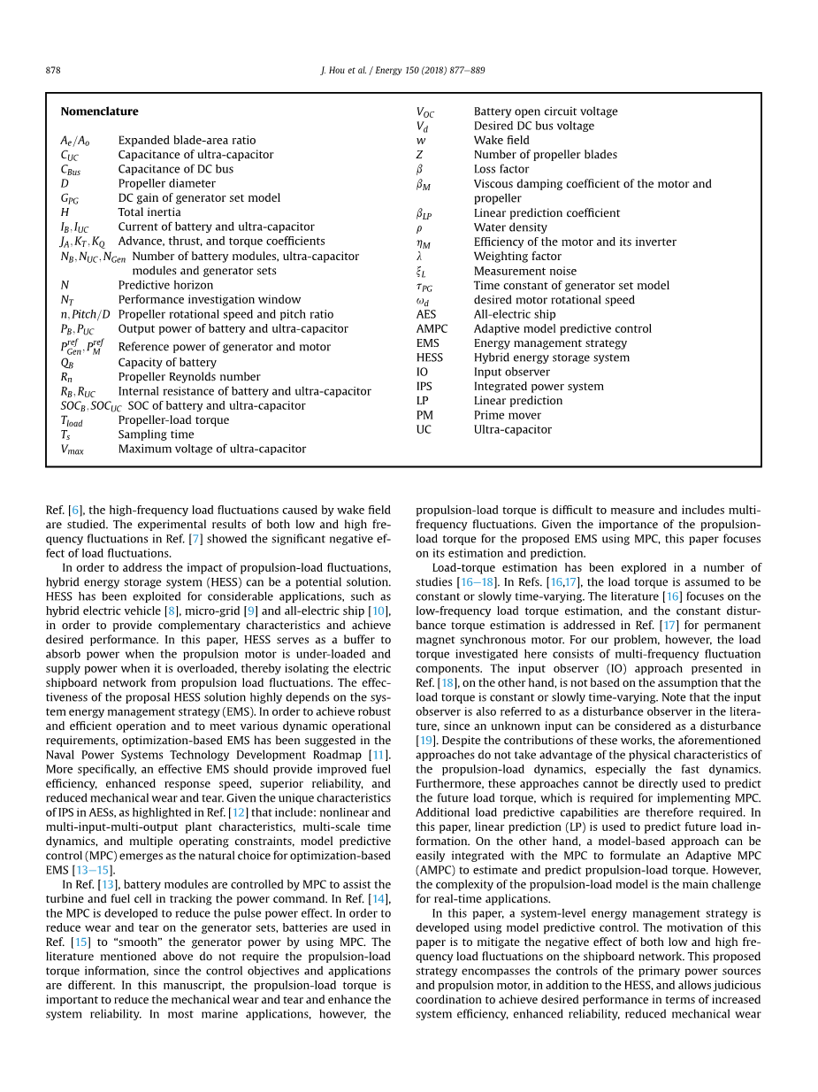 本文提出了一种基于模型预测控制的系统级能源管理策略。本文的目的是为了减轻高频和低频载荷波动对船舶网络的负面影响。除了HESS外,该策略还包含了对主要动力源和推进电机的控制,并允许适当的协调以实现预期的性能,从而提高系统效率、增强可靠性、减少机械磨损和撕裂,并改进了负载跟踪能力。本文重点研究了基于mpc的电磁系统中推进力矩的估计和预测问题。本研究的主要贡献总结如下: