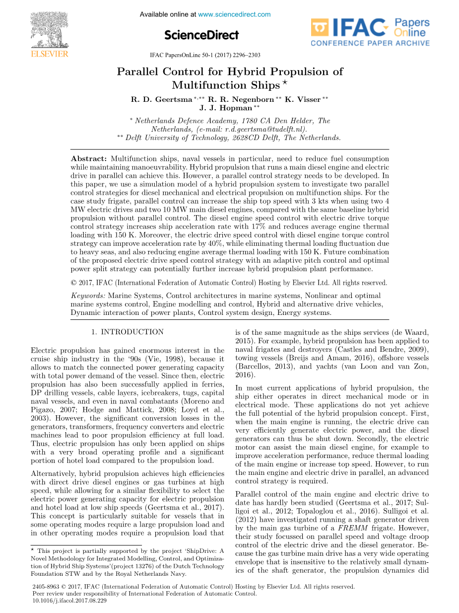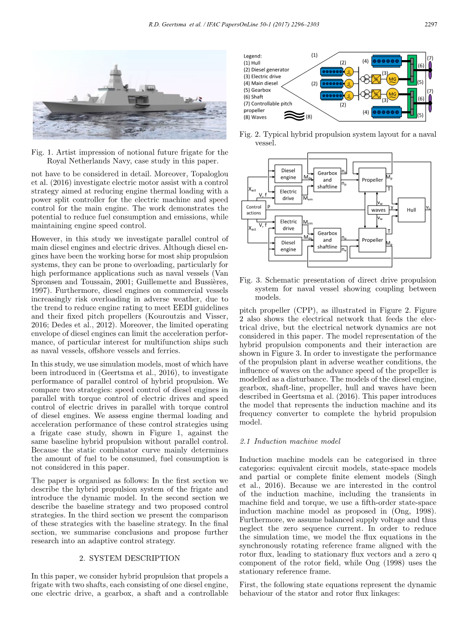 在本研究中,我们使用仿真模型,其中大多数具有(Geertsma et al。,2016)中引入了混合动力的并行控制性能 我们比较两种策略:柴油机的速度控制与电驱动和速度的转矩控制并行与转矩控制并行控制电驱动柴油发动机。 我们评估发动机的热负荷并这些控制策略的加速性能使用一个护卫舰的案例研究,如图1所示,相同的基线混合动力,无需并行控制。因为静态组合曲线主要决定消耗的燃料量,燃料消耗为本文未考虑。
