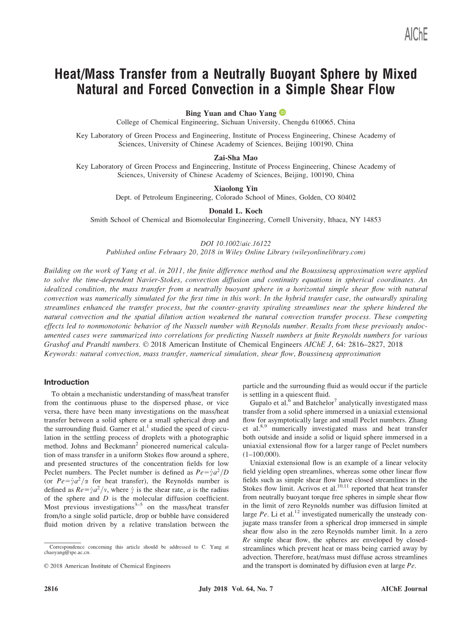 以2011年Yang等人的工作为基础,采用有限差分法和Boussinesq(布辛涅斯克)近似法求解了球坐标系下随时间变化的Navier-Stokes(纳维叶-斯托克斯)对流扩散和连续性方程。这项工作在理想条件下,首次对在自然对流的水平简单剪切流中的中性浮力球传来的传质进行了数值模拟。在混合传递情况下,向外螺旋流线增强了传递过程,但球体附近的反重力螺旋流线阻碍了自然对流,而空间稀释作用削弱了自然对流传递过程。这些竞争效应造成了Nusselt number(努塞尔数)与Reynolds number(雷诺数)的非单调行为。这些先前未记录的案例的结果被汇总为用于预测各种Grashof(格拉晓夫数)和Prandtl number(普朗特数)的有限雷诺数下的Nusselt number(努塞尔数)的相关性。copy;2018美国化学工程师学会AIChEJ,64:2816-2827,2018关键字:自然对流传质数值模拟剪切流Boussinesq(布辛涅斯克)近似法。