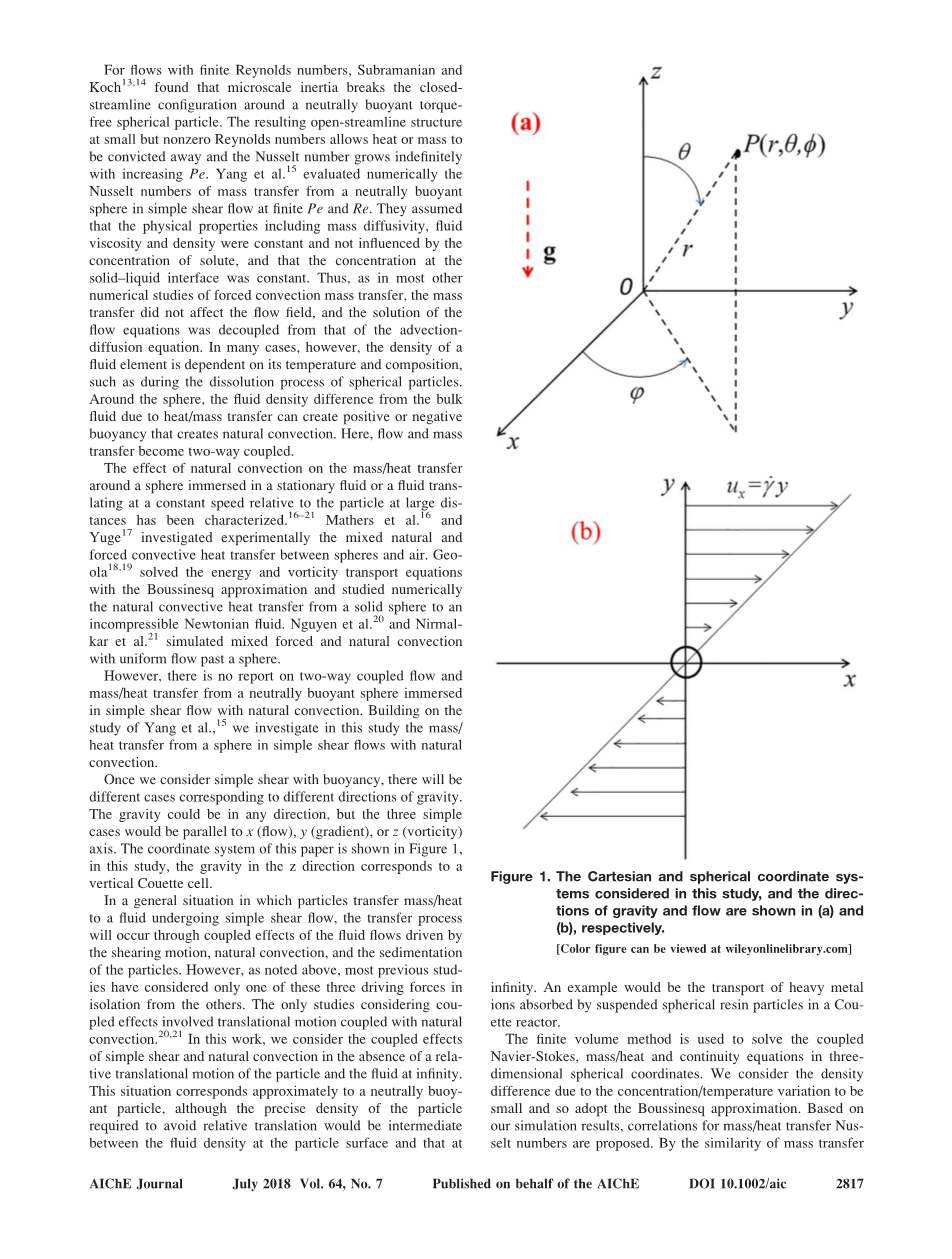 在一般情况下,颗粒将质量/热量传递给经过简单剪切流的流体,传递过程将通过剪切运动、自然对流和颗粒沉降驱动的流体的耦合作用而发生。但是,如上所述,大多数先前的研究仅将这三个驱动力中的一个与其他驱动力隔离开来。唯一考虑耦合效应的研究涉及平移运动与自然对流的耦合[20,21].在这项工作中,我们考虑了简单剪切和自然对流的耦合效应,即在无限大的情况下没有粒子和流体的相对平移运动。这种情况大约对应于中性浮力粒子,尽管避免相对平移所需的粒子精确密度将介于粒子表面的流体密度和无限度之间。一个例子是在Couette reactor(库埃特反应器)中传输悬浮的球形树脂颗粒吸收的重金属离子。