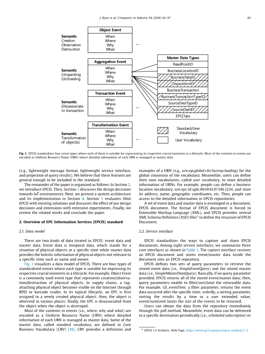 论文的其余部分组织如下。在第2节中,我们将介绍EPCIS。然后,第三部分讨论物联网环境的设计决策。接下来,我们将在第4节中介绍系统架构及其实现。第5节使用现有的解决方案评估Oliot EPCIS,并通过大量的实验讨论我们的设计决策和扩展的影响。最后,对本文的相关工作进行了回顾和总结。