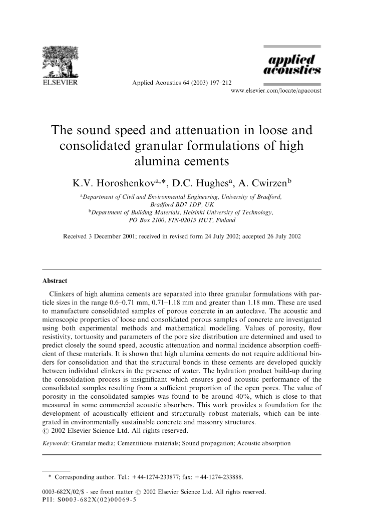 摘要:高铝水泥的熟料被分成三种颗粒结构,分别为0.6-0.71 mm、0.71-1.18 mm和大于1.18 mm的颗粒尺寸。它们被用来在高压釜中制造多孔混凝土的固结样品。用实验方法和数学模型研究了混凝土疏松和固结多孔试样的声学和微观特性。从而测定材料的孔隙率、流阻率、弯曲度和孔径分布参数,并利用这些参数对材料的声速、声衰减和正入射吸收系数进行了预测。结果表明,高铝水泥不需要额外的粘结剂来进行固结,并且在有水的情况下,这些水泥中的结构键在单个熟料之间可以迅速形成。在固结过程中水化产物的积累并不明显,这保证了由足够比例的开放孔隙所形成的固结样品具有良好的声学性能。固结试样的孔隙率约为40%,与一些商用吸声材料的孔隙率相近。这项工作为这种声学性能好且结构坚固的材料的开发提供了基础,其可以集成在环境可持续发展的混凝土和砌体结构中。