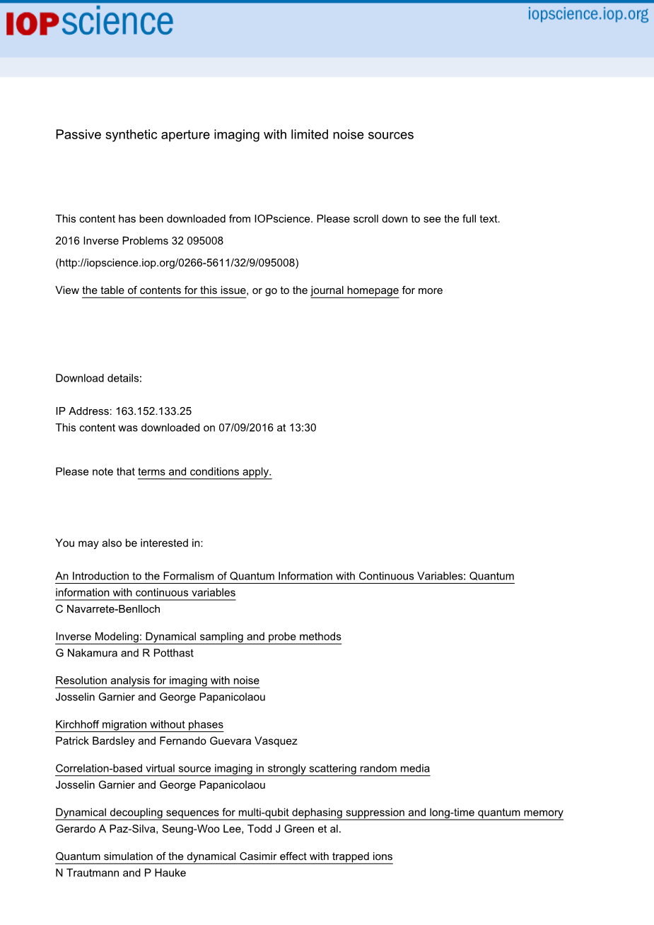 摘要:研究被动合成孔径成像问题。单个移动的接收器天线记录由一个或几个远距离噪声源并由一个或几个反射器反向散射的随机信号生成。源通过固定随机过程建模发出噪声信号。在连续时间窗内,将接收到的信号计算得到的自相关函数相加,对多普勒因子进行校正,并通过适当的传播时间进行偏移,来对反射器成像。其中多普勒效应起着重要的作用,可用于分辨率的提高。当噪声源位置未知时,即使只有非常少量的噪声源,也可以根据与噪声带宽的记录成正比的精度来定位反射器。当噪声源的位置已知时, 即使只有一个噪声源,反射器可以根据与载波波长成正比、与接收机轨迹的长度成反比的横向距离分辨率(即合成孔径)来定位,并且距离分辨率与带宽倒数成正比。