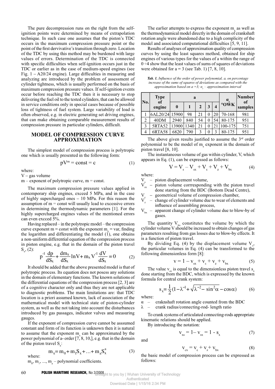 在压缩过程中的多方模型计算中,当活塞行程作为参数时,多方压缩曲线的指数可以用幂多项式来替换。此时,三阶多项式最为适用。在模型的建立中考虑了以下内容:气缸的设计参数、压缩过程中气缸磨损的影响和气体的影响、确定活塞上止点(TDC)的定位误差、源于示功图截断的测量误差。提出的非线性模型的解决方案是基于其部分线性化、最小二乘法的应用以及实验中已知的最佳测定方法的应用。该模型有可能实现通过示功图燃烧过程的分析处理以确定上止点位置,总压缩比的计算,示功图的截断值,以及图中到达上止点前发生自燃的最大压力的测定。