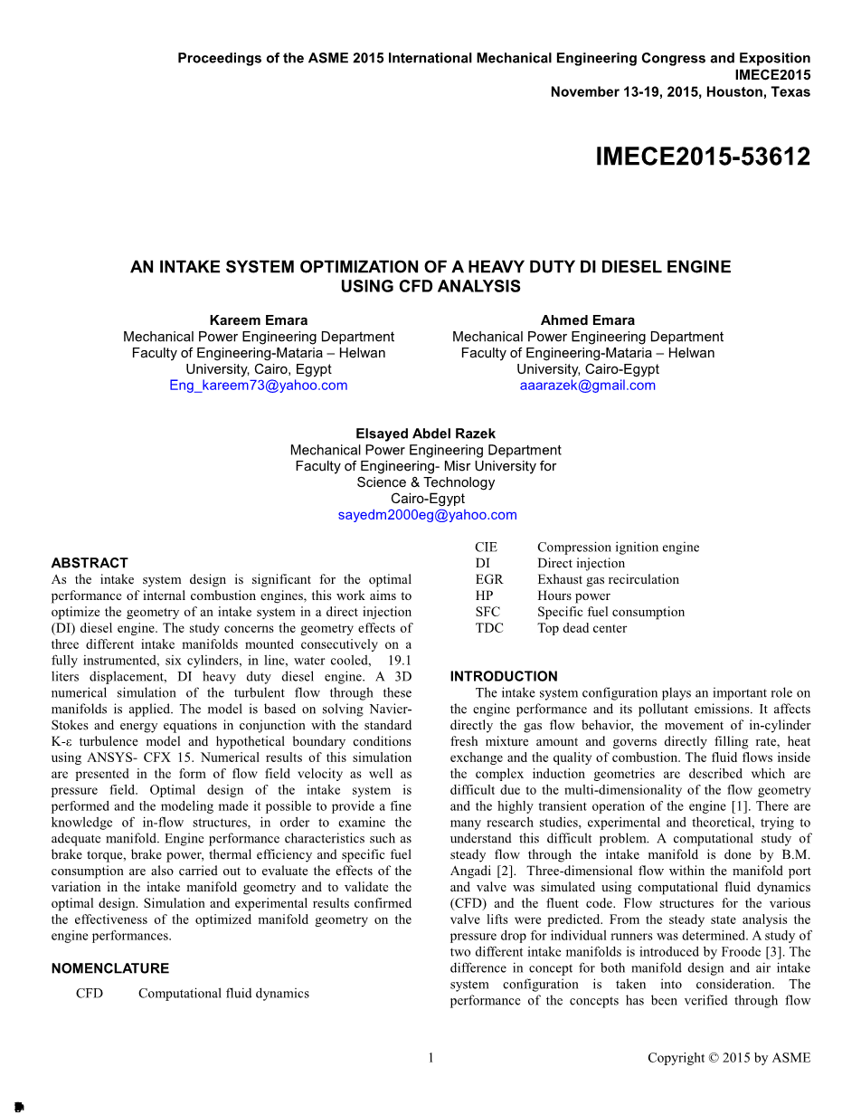 AN INTAKE SYSTEM OPTIMIZATION OF A HEAVY DUTY DI DIESEL ENGINE