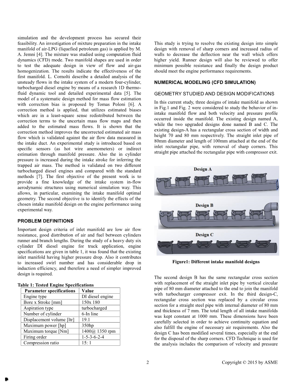 进气歧管的重要设计标准是低空气阻力,良好的空气和燃料之间的气缸和分支长度的分配。在重型汽车六缸直喷式柴油机的研究过程中,在表1中给出了发动机规格,并发现了现有的进气歧管具有较高的压力降。它有助于增加旋流数,并具有相当的下降,在感应效率,因此需要更简单的改进设计是必需的。