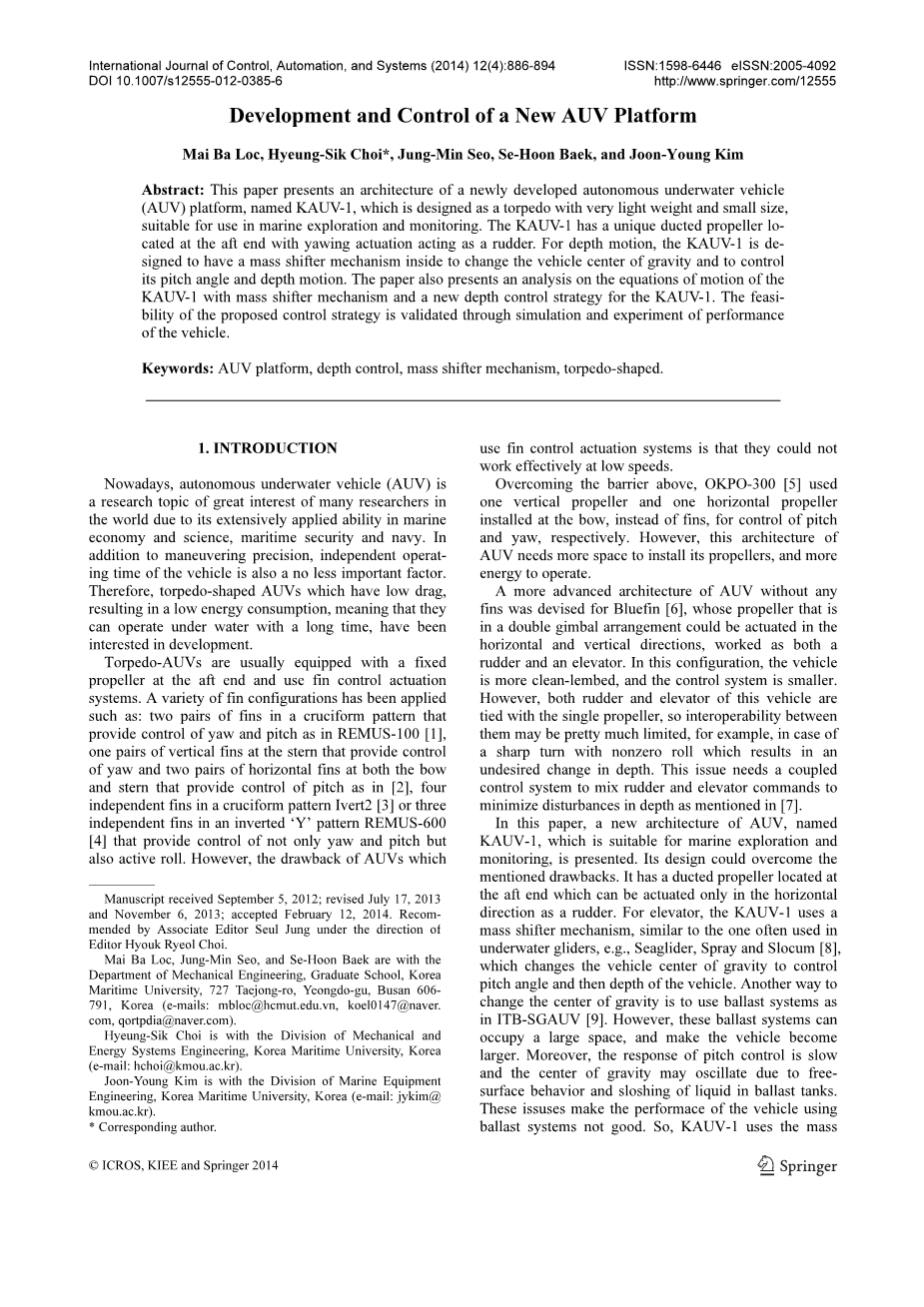 摘要:本文提出了一种新开发的自主水下航行器(AUV)的体系结构,名为KAUV-1,设计成一枚鱼雷的样式,具有重量轻,体积小的特点,适合用于海洋勘探和监测。KAUV-1有一个独特的导管螺旋桨在尾部的位置偏航时驱动作为舵。深度运动,KAUV-1设计质量移器机制改变车辆重心和内部控制其螺旋角和深度运动。本文还提出了一种分析的运动方程KAUV-1大规模移器机制和一个新的深度KAUV-1控制策略。KAUV-1的可行性仿真实验验证了所提出的控制策略及其性能。