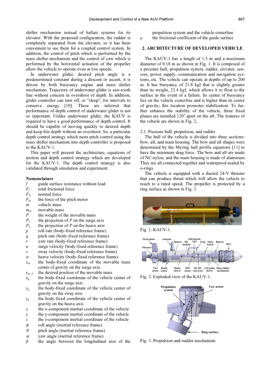 本文提出了一个新的AUV架构,命名KAUV-1,适合海洋勘探和监控。它的设计可以克服上文提到的缺点。其位于尾部的导管螺旋桨,只能作为一个舵在水平方向驱动。对于升降舵,KAUV-1使用质量切换机制,类似于一个经常使用的水下滑翔机。例如,Seaglider, Spray和Slocum [8],利用改变了航行器重心来控制自身倾斜角,然后控制其深度。另一种改变重心的方法是使用压载系统,像ITB-SGAUV[9]中。然而,这些压载系统占了很大空间,使航行器较大。此外,控制倾斜的反应是缓慢的,而且重心可能由于自由面运动和压载舱液体晃动而产生振荡。这些问题导致利用压载系统的航行器性能不好。所以,KAUV-1使用质量移动装置代替压载系统来实现升降。对于提出的结构,方向舵和升降舵完全分开,因此,它很方便的使用两个控制系统。此外,倾斜的控制是由质量移动执行的,而偏航的控制是由水平螺旋桨执行的,即使是在航行器低速运行。