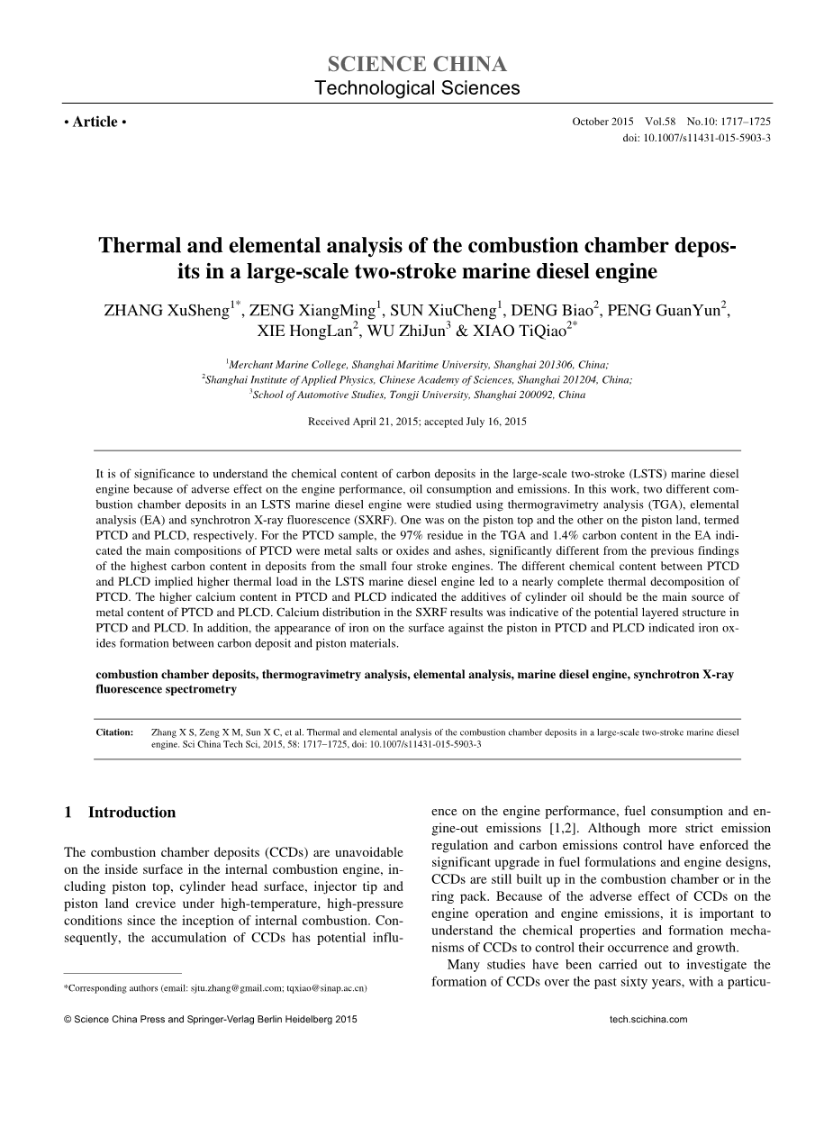 Citation: Zhang X S, Zeng X M, Sun X C, et al. Thermal and elemental analysis of the combustion chamber deposits in a large-scale two-stroke marine diesel engine. Sci China Tech Sci, 2015, 58: 17171725, doi: 10.1007/s11431-015-5903-3