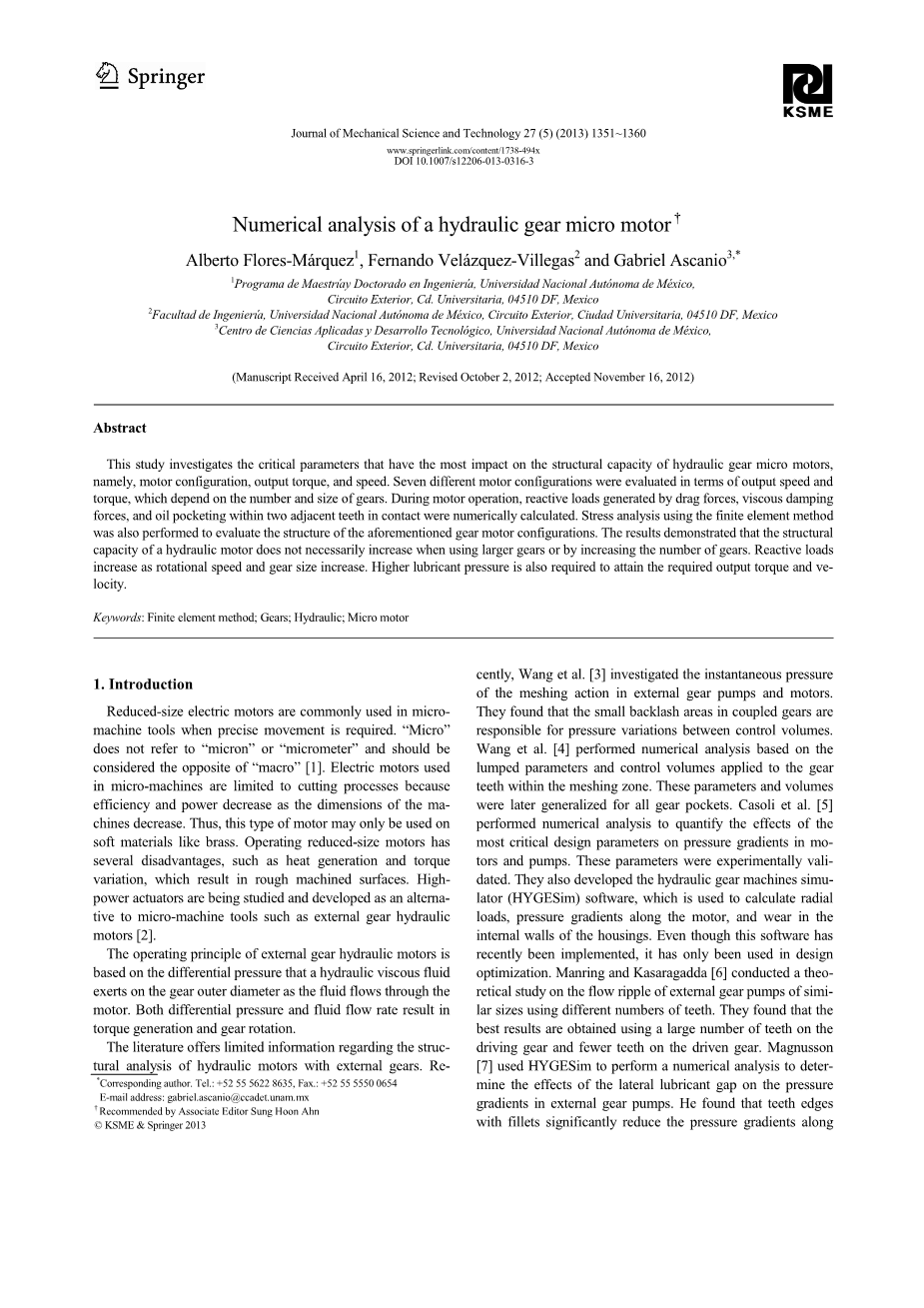 这两款马达通常用于当需要精确的运动时的微型机械。“微观”不是指“微小”或“微米”,应该考虑相反的“宏观”[1]。电动马达使用微型机器的原因仅限于降低切割过程的效率和功率和机器的尺寸。因此,这种类型的电机可能只被用于软铜等材料。操作这两款马达有一些缺点,如产生的热和扭矩变异,导致加工表面粗糙。大功率的执行机构正在研究和发展作为替代微电机工具,如外部齿轮液压马达[2]。外部齿轮液压马达的工作原理是基于具有液压粘性流体的压差的流体流经齿轮外径马达。差压和液体流速导致转矩生成和齿轮旋转。本文提供了有限的信息结构分析与外部齿轮液压马达。最近,王等人[3]研究瞬时压力作用在外部齿轮的泵和马达时.他们发现有弹性的区域耦合的齿轮间的压力变化。王等人,[4]数值分析的基础上进行总参数的控制,并作用于在啮合去内的齿轮的齿。这些参数和控制后来被广义的定义所有齿轮的齿距。Casoli等人。[5]进行了量化的影响数值分析.在马达的压力梯度和泵的最关键的设计参数。这些参数是通过实验验证的。他们还开发了液压齿轮机模拟器(HYGESim)软件,用于计算电动机的径向负荷、压力梯度,穿的腔室的内壁。虽然这个软件最近被实现,它只有被用于设计优化。Manring和Kasaragadda[6]对相似的外部齿轮泵的流量脉动使用不同数量的牙齿大小进行了理论研究。他们发现最好的结果是使用大量的主动齿轮和更少的从动齿轮上。所以Magnusson [7]HYGESim用来进行数值分析来确定横向润滑剂的压力梯度在外部齿轮泵的效果差距。他发现齿的边缘与叶片显著减少的压力梯度在微型机械的结构关系。