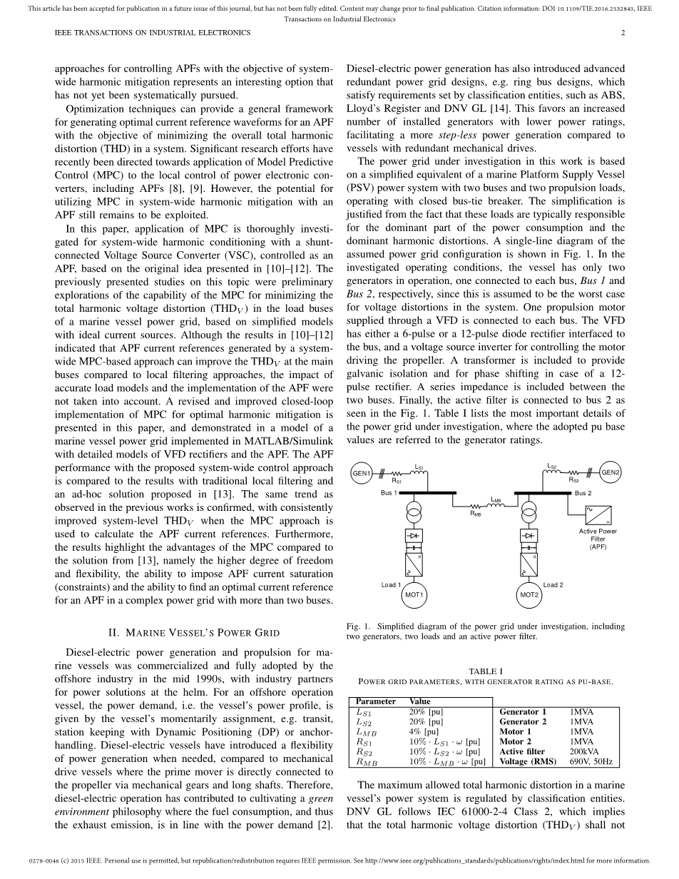 本文中,对于系统范围并联连接电压源转换器(VSC)谐波调节,模型预测控制应用贯穿整个研究过程,基于在[10]—[12]中提出的最初想法,作为有源电力滤波器(APF)控制。先前所提及在这个主题上的研究,初步探索了对于最小化船舶电网中负载总线中的总谐波电压失真(THDv)时,基于理想电流源简单模型的模型预测控制的容量。尽管这些结果在[10]–[12]中表明有源电力滤波器(APF)通过系统范围模型预测控制途径在主要总线中产生的电流参考,相比局部滤波途径,能够提高总谐波电压失真(THDv),但是精确负载模型和有源电力滤波器应用将会变的不可控。在本文中,对于所提出的最佳谐波抑制,一个经修改和完善的闭环模型预测控制(MPC),在MATLAB/ Simulink环境中,演示了船舶电力网模型的实现,以及详细地描述了可变频率装置(VFD)整流器和有源电力滤波器(APF)模型。本文中所提出的系统范围控制途径的有源电力滤波器(APF)性能与传统局部滤波器和一个在[13]中提出的自组解决方案相比较。在先前研究工作中观察到的趋势是被认可的,当模型预测控制方法被用来计算有源电力滤波器电流参考值而持续提高了系统总谐波电压失真(THDv)水平。更加进一步说,比起在[13]中提到的解决方法,模型预测控制(MPC)结果更加突出了他的优点,即为更高的灵活性和自由度、施加有源电力滤波器电流饱和度(约束)以及具有在两个以上总线的复杂电力网中为有源电力滤波器(APF)找到一个最佳电流参考的能力。
