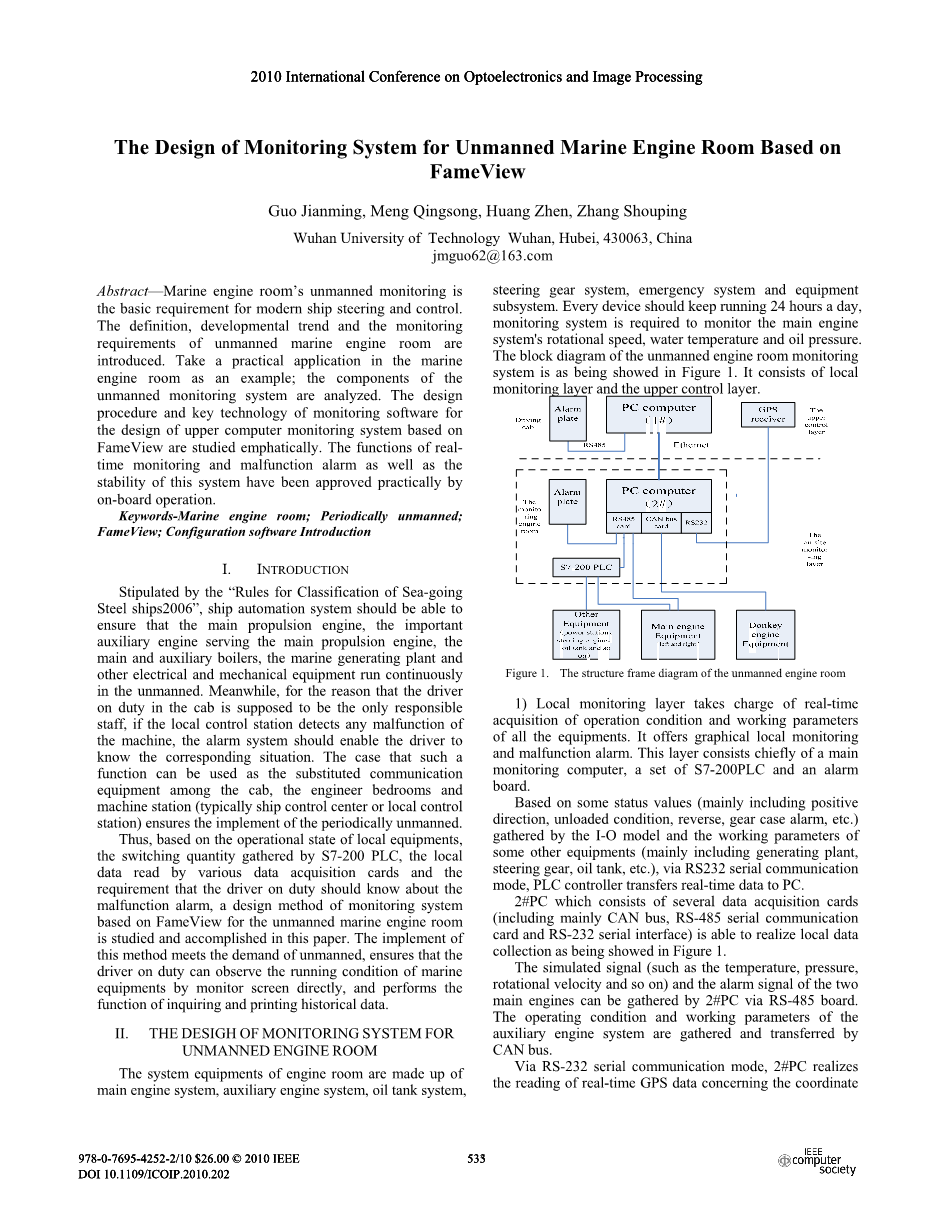 摘要—船用柴油机机舱的无人监控是现代船舶驾驶和操控的基本要求。在规定中,无人船用柴油机机舱的发展趋势和监测要求应该有所说明。举一个船用柴油机机舱的实际应用作为案例;分析无人柴油机机舱监控系统的各个模块。监控软件的程序设计和关键的技术对于基于FameView上位机监控系统的设计是着重研究的。实时监控功能和故障报警以及系统的稳定性,在实际上是甲板操作所允许的。