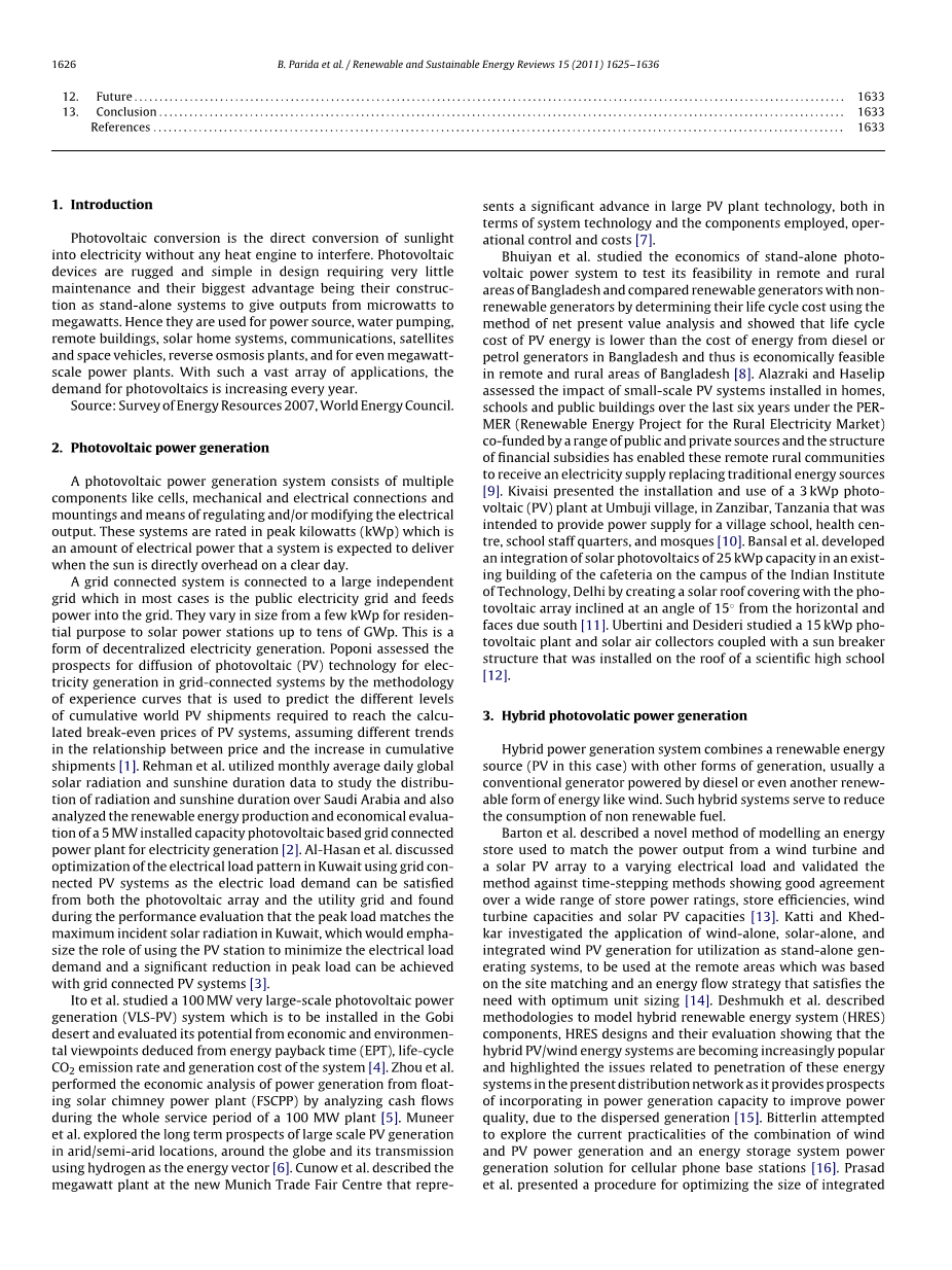混合动力发电系统将可再生能源(在这种情况下为PV)与其他形式的发电相结合,通常是由柴油或甚至其他可再生能源形式的风力发电。这种混合系统用于减少不可再生燃料的消耗。巴顿等人描述了一种用于将来自风力涡轮机和太阳能光伏阵列的功率输出匹配到能量储存器的新型方法,以改变电力负载,并且验证了该方法针对在宽范围的商店功率额定值上表现出良好一致性的时间步长方法,存储效率,风力发电机容量和太阳能光伏容量[13]。 Katti和Khedkar调查了将风力发电,单独太阳能和集成风力发电用于独立发电系统的应用,将在基于现场匹配的偏远地区和符合能源流量战略的情况下使用需要最优的单元尺寸[14]。 Deshmukh等人描述了模拟混合可再生能源系统(HRES)组件的方法,HRES设计及其评估,表明混合光伏/风能系统正变得越来越受欢迎,并突出显示了与现有配电网络中的这些能源系统渗透相关的问题,因为它提供由于分散的一代,纳入发电能力的前景,以提高电力质量[15]。 Bitterlin试图探讨风电与光伏发电相结合的现实实践和蜂窝电话基站的储能系统发电解决方案[16]。 Prasad等人提出了利用电池备份优化集成式风力,光伏系统规模的程序,系统的最佳尺寸设计基于发电生命周期单位成本(LUC)或相对过剩功率(REPG)计算值,或未充分利用的能量概率(UEP),用于指定的供电概率不足(DPSP)[17]。