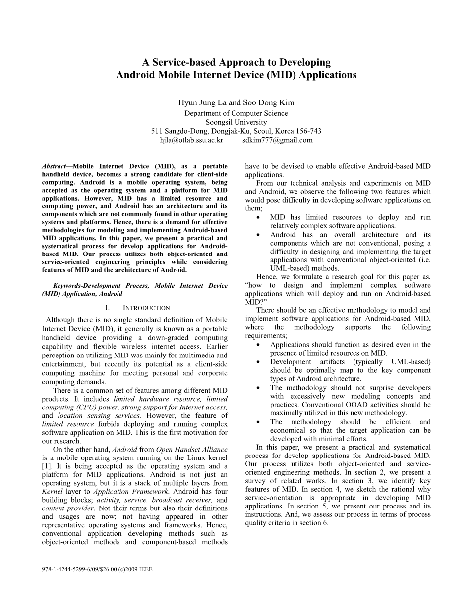 我们的过程使用面向对象和面向服务的工程方法。在第2节,我们提出相关作品调查。在第3节,我们识别关键MID的特点。在第4节中,我们描述理性为什么服务导向适合开发MID应用程序。在第5节,我们介绍我们的过程及其说明。并且,我们评估我们的流程质量标准。