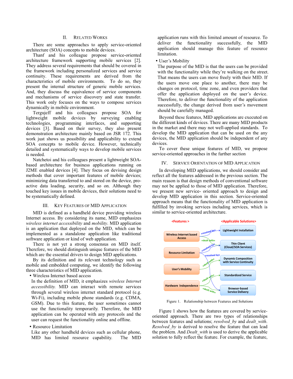 在开发MID应用程序时,我们应该考虑和反映前一节中所述的所有功能。主要原因是常规软件的设计方法可能不适用于MID应用程序的。因此,我们提出了新的面向服务的设计方法,在本节中开发MID应用程序。服务导向方法意味着MID应用程序的功能通过调用包括服务在内的服务来实现类似于面向服务的架构。图1示出了如何通过面向服务的方法来覆盖这些特征。有两种类型的关系功能和解决方案之间;已解决和已处理。