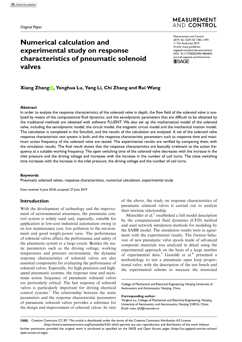 本文通过CFD方法计算阀芯的空气动力,得到空气动力学参数,并在Simulink中建立了空气动力学模型。通过分析空气动力学模型,电路模型,磁路模型和机械运动模型来完成仿真计算。在实验中,本文创新地提出了一种通过出口检测电磁阀响应特性的方法压力与电流同步检测,更加直接,准确。建立了一套电磁阀动态特性测试系统。该测试系统可以方便地在MS级别测量电磁阀的泄漏,响应时间,动作频率,启动压力和其他参数,这确保了实时性能。通过将数值计算与实验结果进行比较,验证了数值计算模型的正确性。