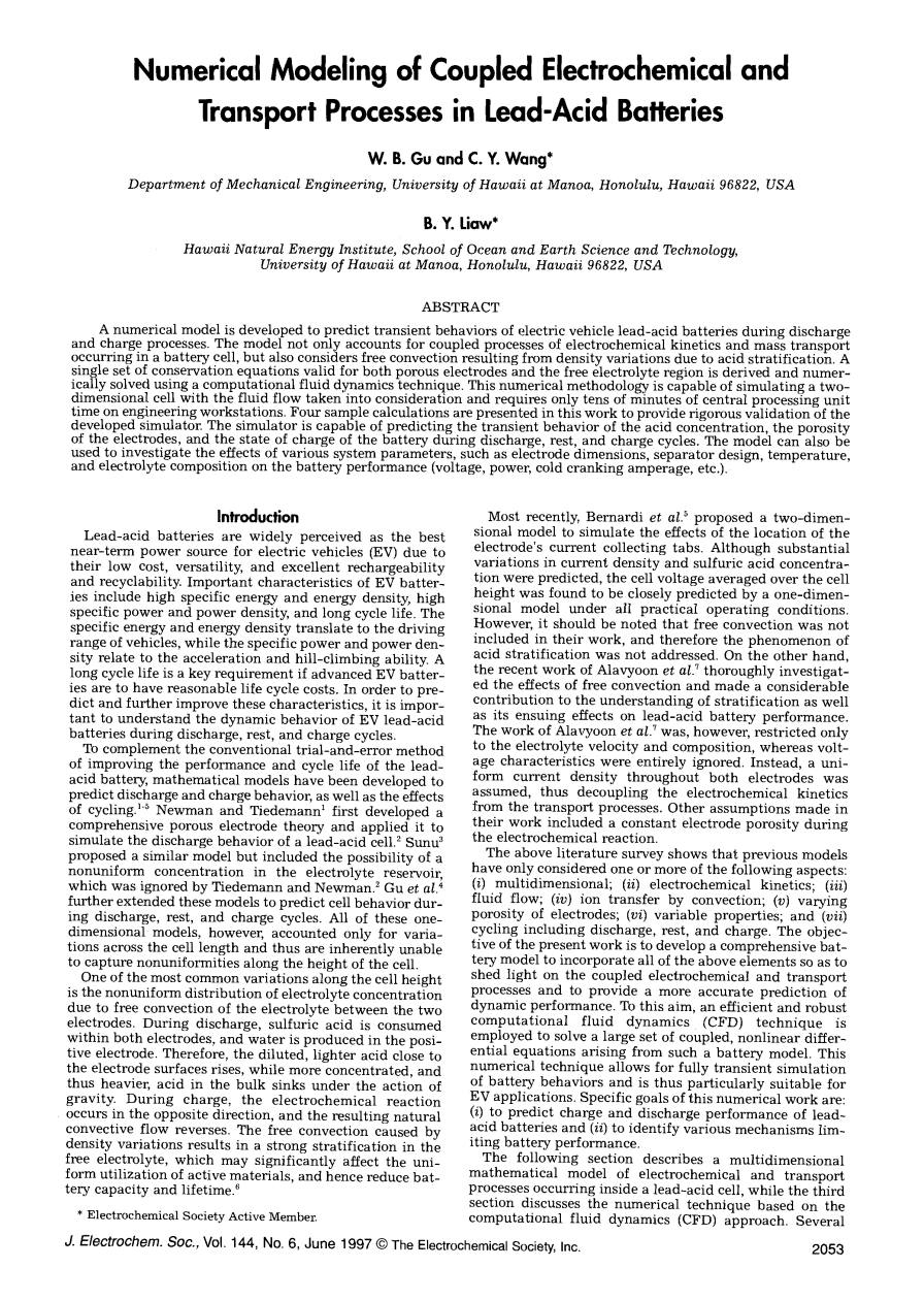 这篇文章建立了一个预测电动汽车铅酸蓄电池充放电过程瞬态特性的数值模型。该模型不仅考虑了电池中发生的电化学动力学和质量传输的耦合过程,还考虑了由于酸分层引起的密度变化而导致的自由对流。从而导出了一组适用于多孔电极和自由电解液区域的守恒方程,并用计算流体动力学技术进行了数值求解。这种数值方法能够对考虑了流体流动的二维电池进行仿真,这在工程工作站的中央处理单元上只需要几十分钟的时间。这篇文章给出了四个计算实例,对建立的模型严格地进行验证。这个模型能够仿真酸浓度的瞬态特性、电极的孔隙率以及电池在放电、待机和充电循环期间的充电状态。还可用于研究各种系统参数,如电极尺寸、隔膜设计、温度和电解液成分对电池性能(电压、功率、冷起动电流等)的影响。