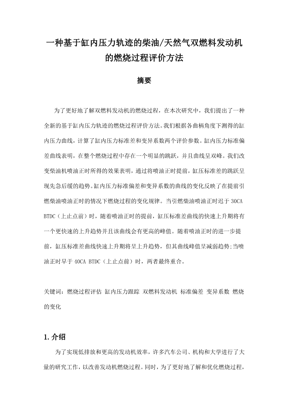 一种基于缸内压力轨迹的柴油/天然气双燃料发动机 的燃烧过程评价方法外文翻译资料