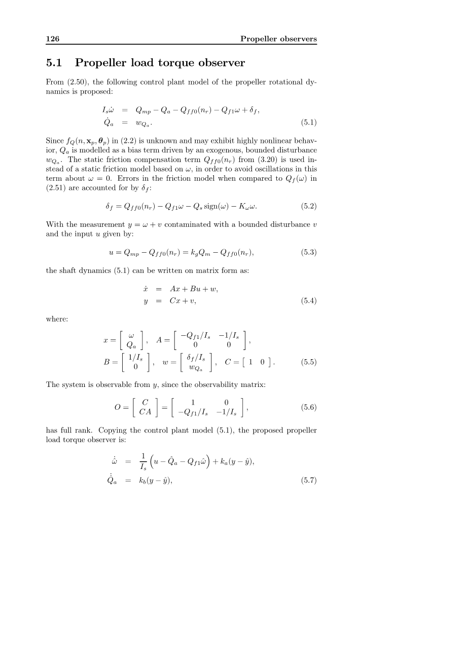 第5.1节介绍了一个螺旋桨负载扭矩观测器。这是对在Smogeli(2004a)等中首次引入的观测器的修改。第5.2节提出了一种基于非线性参数估计的交替负载转矩估计方法。两种方案都能估计负载扭矩Qa、扭矩系数和扭矩损失系数。第5.3节说明了在某些情况下,如何从扭矩系数估计值推导出推进器推力Ta和推力损失系数的估计值。用于例如推力分配的性能监视在第5.4节中处理。第5.5节通过仿真演示了各种方案的性能。估计方案中对转换和CPP的扩展在第8章中讨论。对于未知线性摩擦系数的情况,可以在附录G中找到一个自适应负载转矩观测器。