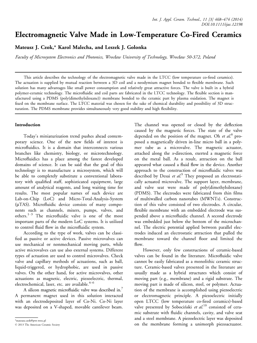 然而,在文献中只能找到很少的以建筑陶瓷为基础的阀门。微流体阀不容易制作成单片陶瓷结构。在文献中提出的以陶瓷为基础的阀通常是由移动的部分(例如,膜)和刚性基板组成的混合结构。移动的部分是由硅,钢,或聚合物制成,使用压电或电磁原理来实现的膜的致动。sobocinski 等人(文献10中)提出的基于LTCC(低温共烧陶瓷)的压电阀由有着流体通道、腔的陶瓷基板,阀座和钢膜组成。压电层上淀积膜形成单晶压电驱动器,所施加的电场产生了压电层的横向扩张和收缩,这些变形造成一个薄膜内部的弯矩和挠度。由于压电致动器的相对刚度高、力传递性能好,使得基于LTCC压电阀具有相当快的反映速度。应用单晶的压电驱动器产生约1.3微米的位移。此外,该解决方案具有以下特点:相当高的功率条件(250伏的电源电压),低的膜偏转,和相对高压力降的阀内流体。satarkar等人(文献11)提出了LTCC中的磁性水凝胶复合阀,并使用由N-异丙基丙烯酰胺制成的用于开发微流体阀的磁性纳米复合材料。施加到结构上的交变磁场在水凝胶中加热Fe3O4纳米微粒,当水凝胶温度高于临界溶液温度时,水凝胶的通道就打开了。贡戈拉-卢比奥和同事提出了一种不同的方法【12,13】,他们开发了基于LTCC的电磁驱动微流控阀。它的组成结构有多层线圈、LTCC基板上的流体通道和由硅元素制成的柔性膜。永久磁铁(smcox)结合到膜上表面。用直径1毫米的磁铁,可以实现30微米厚的矩形硅膜约200微米的偏转。上文所描述的微流体阀所需的电源电压为18伏和电流为150毫安,约2.7瓦的功率。