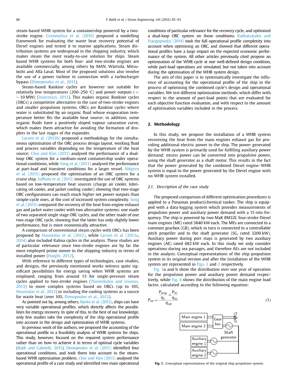 在众多科技工作者的工作中,我们提出了实际工况下船舶余热回收系统的可行性分析。但这项研究,我们的目的主要集中在所需的系统性能,而不是如何实现最优循环变量(Baldi and Gabrielii,2015)。Dimopoulos等人确定了四个工作条件,并把他们考虑在基于蒸汽的余热回收系统的优化问题上。Choi和kim分析了一个特定工况下的案例,并确定了两个主要操作条件特别相关的回收循环,并且基于这些工况对双环有机朗肯循环系统进行了优化。Kalikatzarakis 和Frangopoulos在优化有机朗肯循环系统时考虑了全面的实际工况,并得到不同的工况对系统的预期经济表现有很大的影响。所有前面引用的文章都是在一确定工况下对余热回收系统进行优化,而部分负荷工况仅仅是模拟,在余热回收系统设计的优化过程中不考虑。
