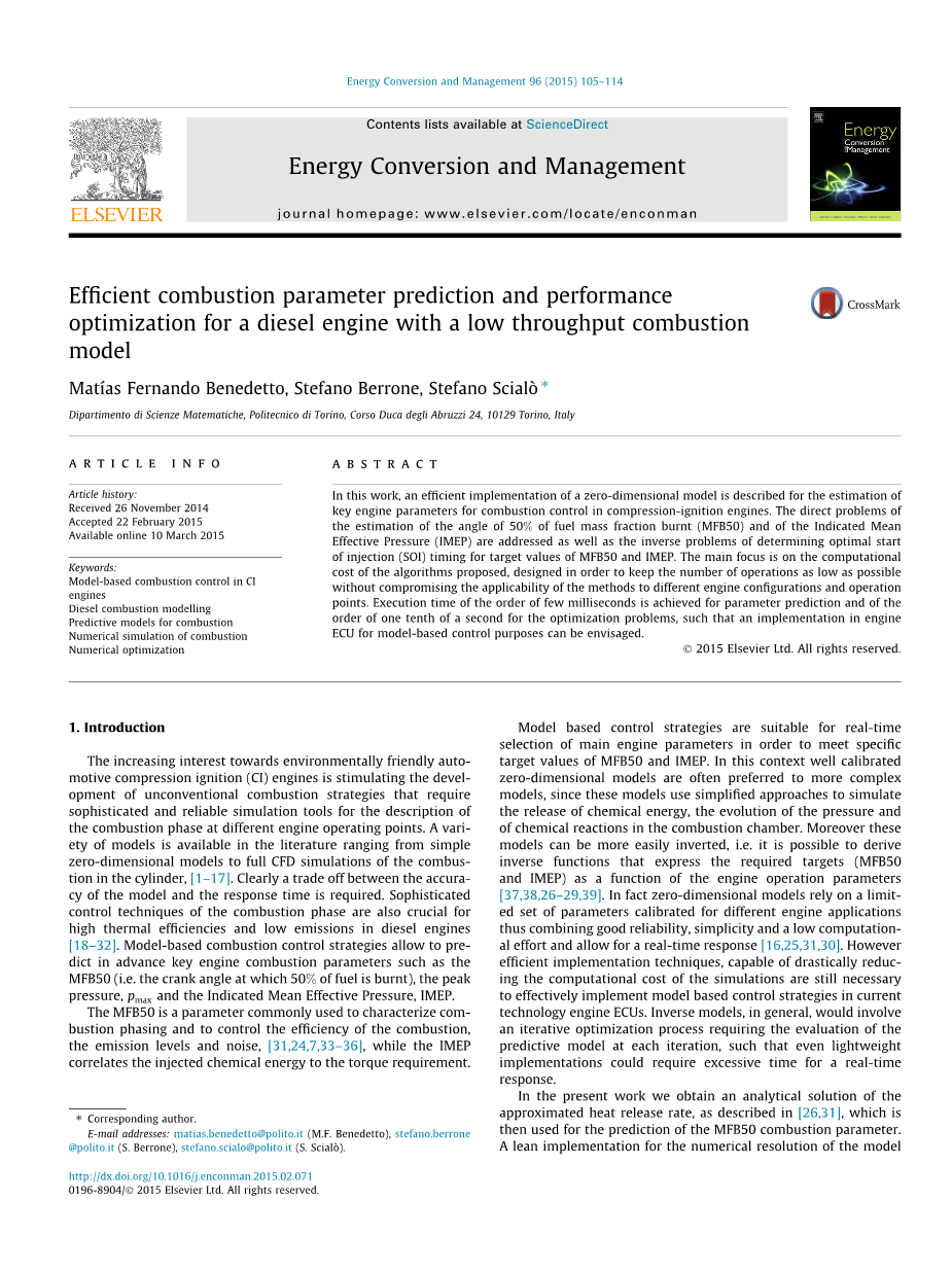 在目前的工作中,我们获得了一个接近放热率的解析解(详情见[26,31]),可以将这个解析解用于MFB50燃烧参数的预测中。该文章也提出了用于IMEP预测的模型数值解析的精确实施。此外,根据被提出的模型,从评估喷射起始角度(SOI)的逆问题中能够得出一个有效的解决策略,而这个喷射起始角度能够提供一个目标MFB50。我们还解决了关于SOI角度评估的逆问题,这个SOI角度能够将IMEP参数最大化,还强调策略的有效实施。在更多计算时间的成本上,该方法可以扩展到通过一些模型在燃烧室内的化学反应来对污染排放物进行预测与优化,[28,29]。