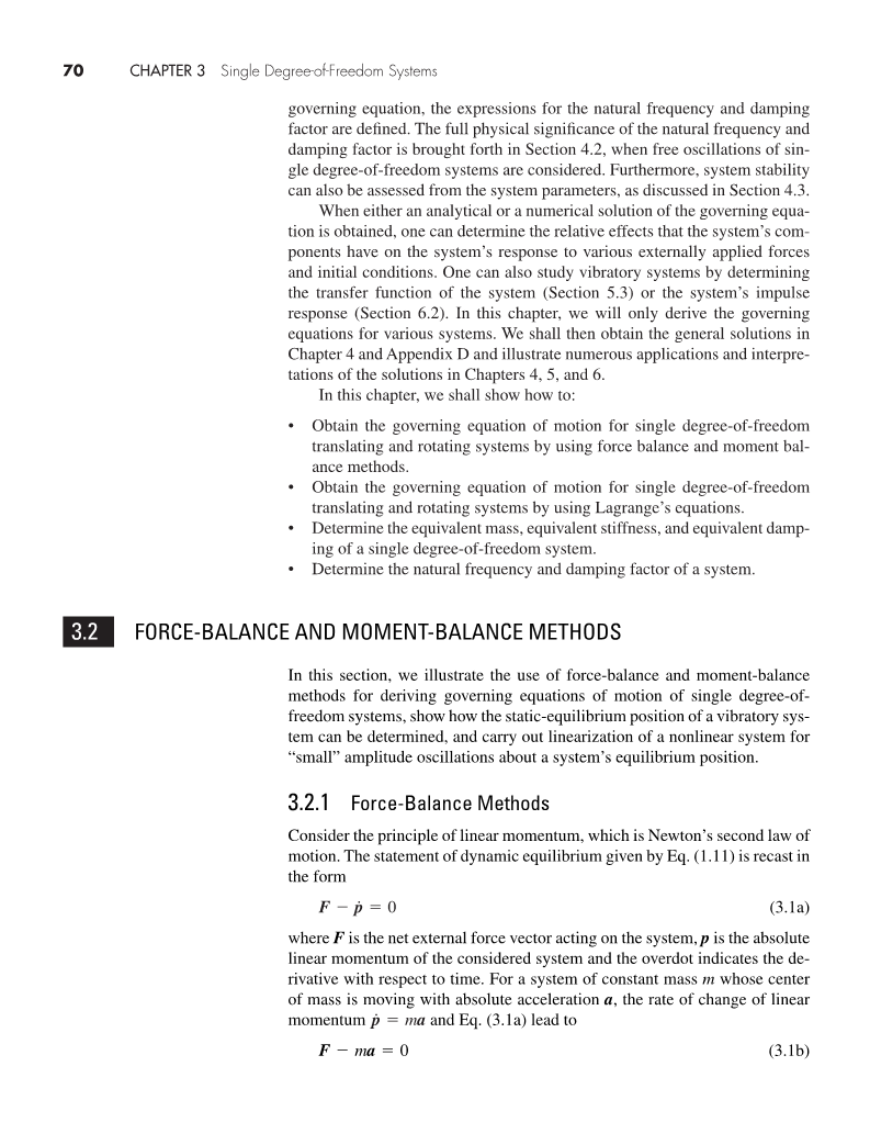 在这一章节中将用两种方法来阐述单自由度系统的运动规律。第1章提到的动量原理是方法之一,包括力的平衡和力矩的平衡。第二种方法是拉格朗日方程,在本章作首次介绍,将在后面的章节得到广泛的应用。当单自由度系统自由振动时,出现在控制方程的参数,固有频率和阻尼系数已经被定义。固有频率和阻尼系数的物理定义在4.2章。此外,系统的稳定性也可以通过系统的参数进行评估,如4.3章。