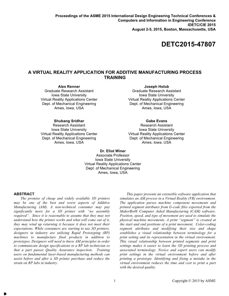 A VIRTUAL REALITY APPLICATION FOR ADDITIVE MANUFACTURING PROCESS TRAINING