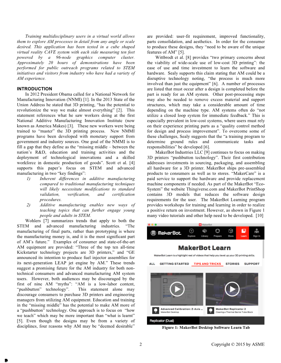 Wohlers [7] summarizes trends that apply to both the STEM and advanced manufacturing industries. “The manufacturing of final parts, rather than prototyping is where the manufacturing money is, and it is the most significant part of AMrsquo;s future.” Examples of consumer and state-of-the-art AM equipment are provided: “Three of the top ten all-time Kickstarter technology projects are 3D printers,” and “GE announced its intention to produce fuel injector assemblies for its next-generation LEAP jet engine by AM.” These trends suggest a promising future for the AM industry for both non- technical consumers and advanced manufacturing AM system users. However, both audiences may be discouraged by the first of nine AM “myths”: “AM is a low-labor content, “pushbutton” technology”. This statement alone may