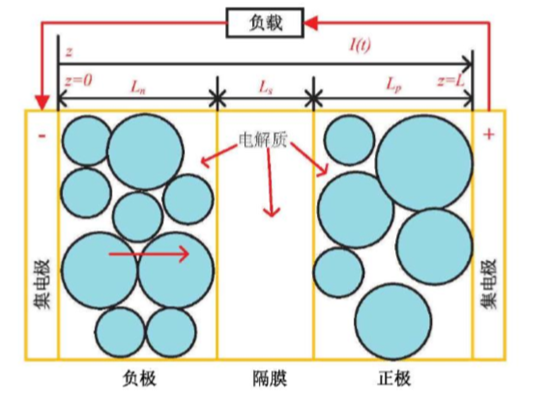 一般情况下,电解液、隔膜、负极、正极是锂离子电池重要的构成部分。较为经常使用的正极材料主要有磷酸铁锂、锰酸锂、钴酸锂和三元聚合物等,而能否良好地嵌入锂离子是评估负极材料的重要指标,通常选用石墨作为负极材料。电解质和溶剂构成了电解液,由于离子只能穿过隔膜而电子却不能穿过,所以现今广泛使用的材料主要分为聚乙烯和聚丙烯等。下图2-1显示了锂离子电池的充放电原理,在充电期间,Li 依次通过正极,电解质和隔膜,最后进入到负极中,同样放电期间,锂离子反方向运动,依次通过负极,电解质,最后穿过隔膜回到正极,电子也在这些该过程中连续地进行运动,宏观上形成了回路。而一些不利的反应通常在锂离子的嵌入与脱出中产生,大大加快了锂离子的消耗和两极活性材料的损耗,这个过程会让电池性能下降。
